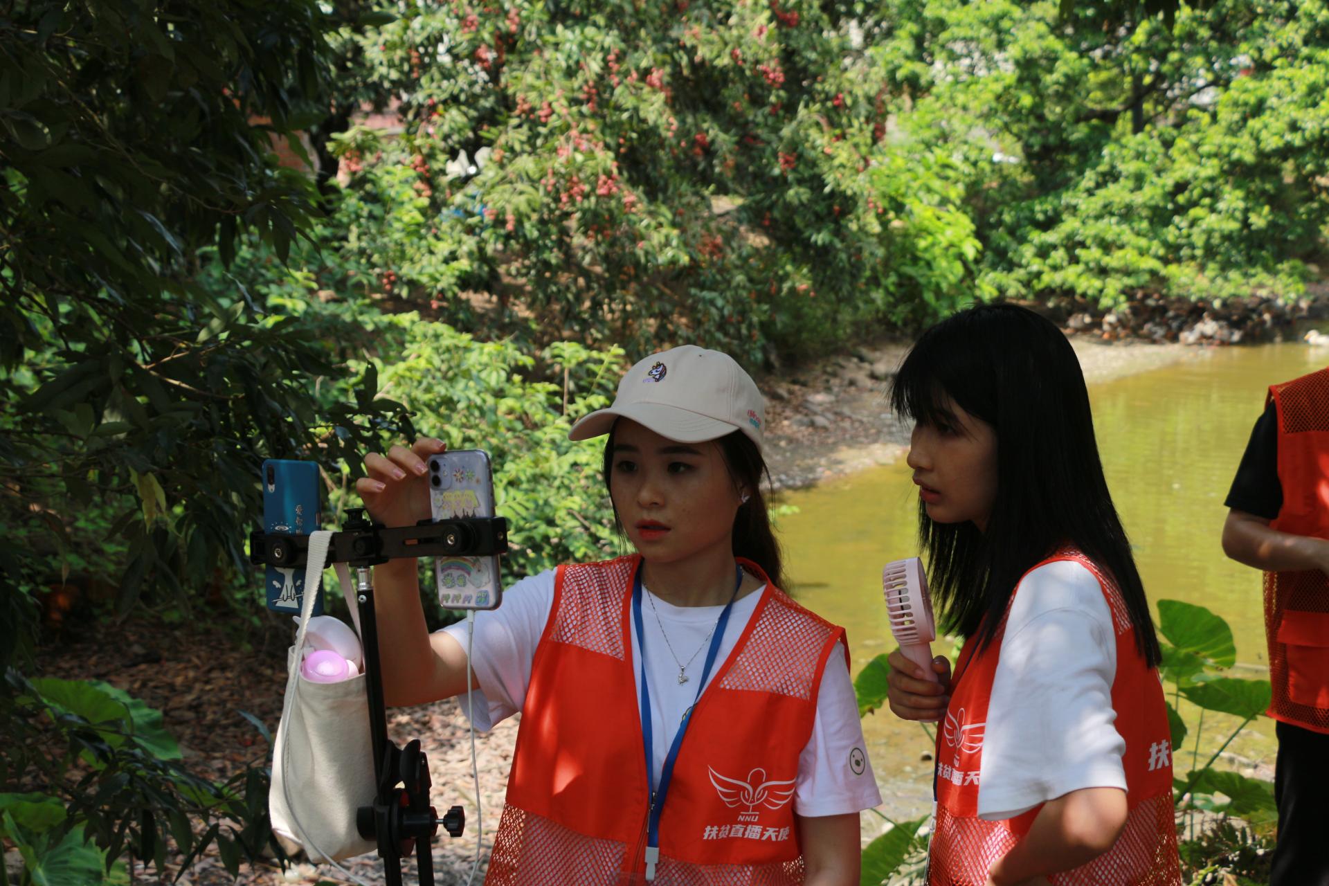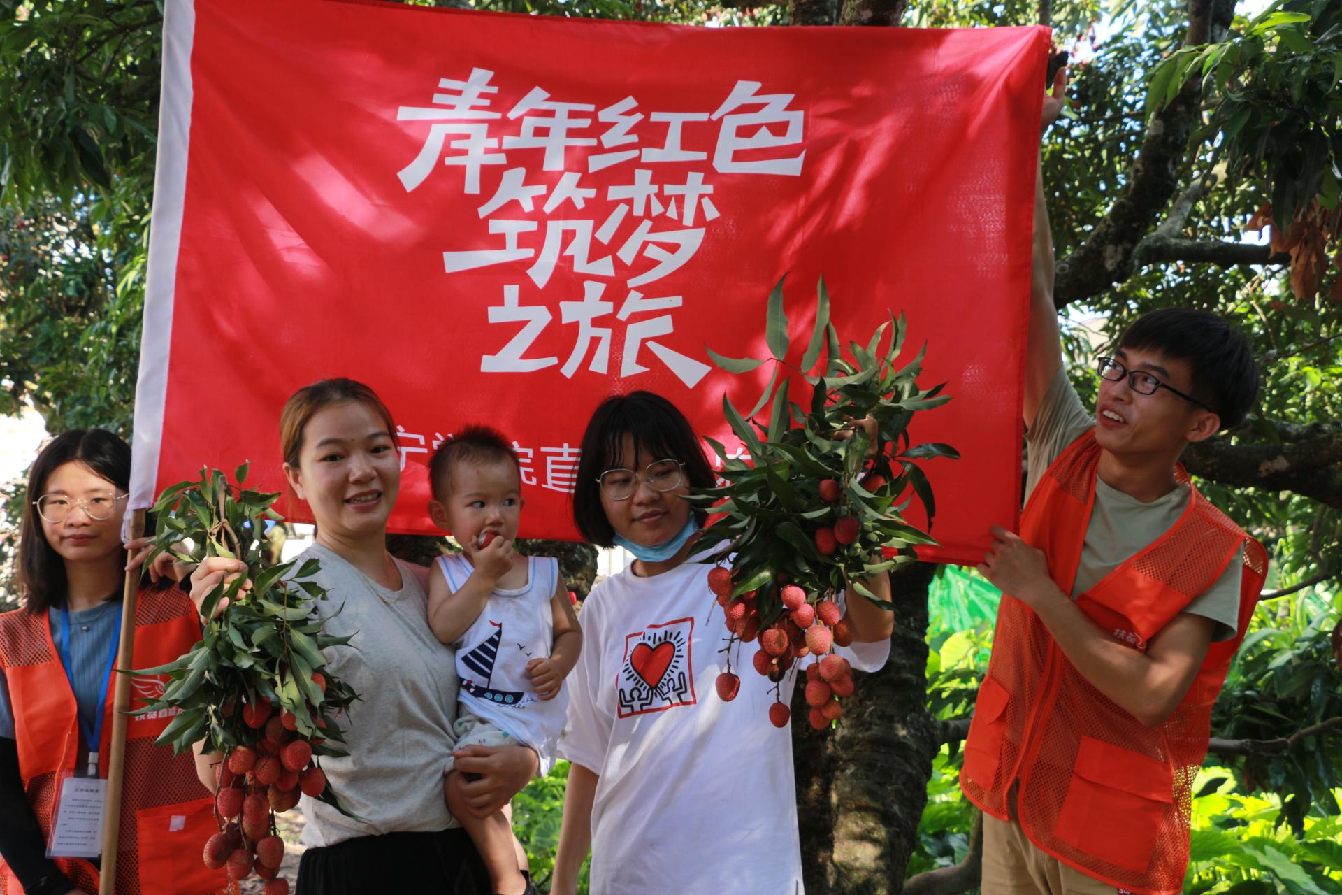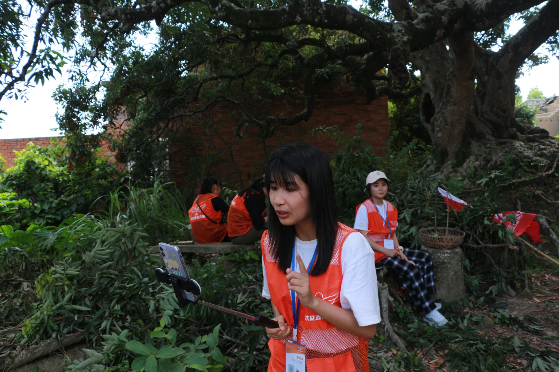 “红色筑梦之旅”公益直播团队的到来,引来村民的围观。得知直播团队的来意后,不时有村民表示要加入,有抱着小孩的妇人、有即将毕业的大学生、还有中学生,大家都跃跃欲试。在村民们的引导下,直播团队一颗挂满果实的有800多年树龄的荔枝树下开展了直播。