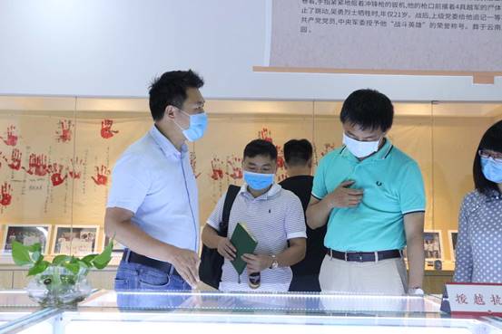 徐健院长一行首先来到创新创业生态基地,观看了学校在第五届中国“互联网+”大学生创新创业大赛中获得全国银奖的项目路演,随后参观了该项目的成果之一—-“不惑青春”英雄精神体验传承基地。马骏院长向徐健院长一行介绍了基地展示的文物,讲述了部分文物的历史典故及边境战事的民族英雄故事。