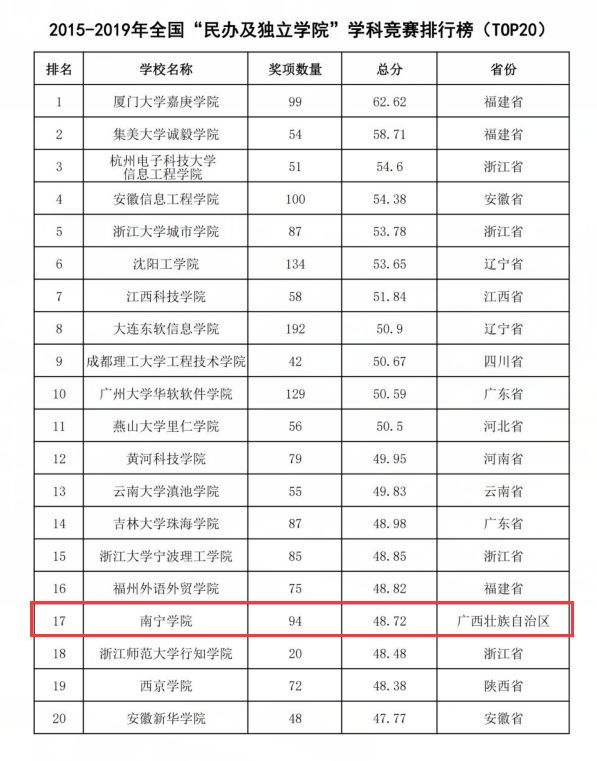 2020年2月22日,中国高等教育学会《高校竞赛评估与管理体系研究》专家工作组发布2015-2019年和2019年全国普通高校学科竞赛排行结果。在全国“民办及独立学院”学科竞赛排行榜中,南宁学院以奖项数量94项,总分48.72分的优异成绩位居同类本科高校全国第17位,较上一年的第18名又向前迈进一步。近年来,学校积极探索应用技术大学的办学道路,紧紧围绕“做人有品格、就业有本领、创业有能力、深造有基础、发展有后劲”的高素质应用型人才培养目标,狠抓学生创新精神和创新实践能力的培养,2019年,学校获评自治区首批深化创新创业教育改革示范高校。