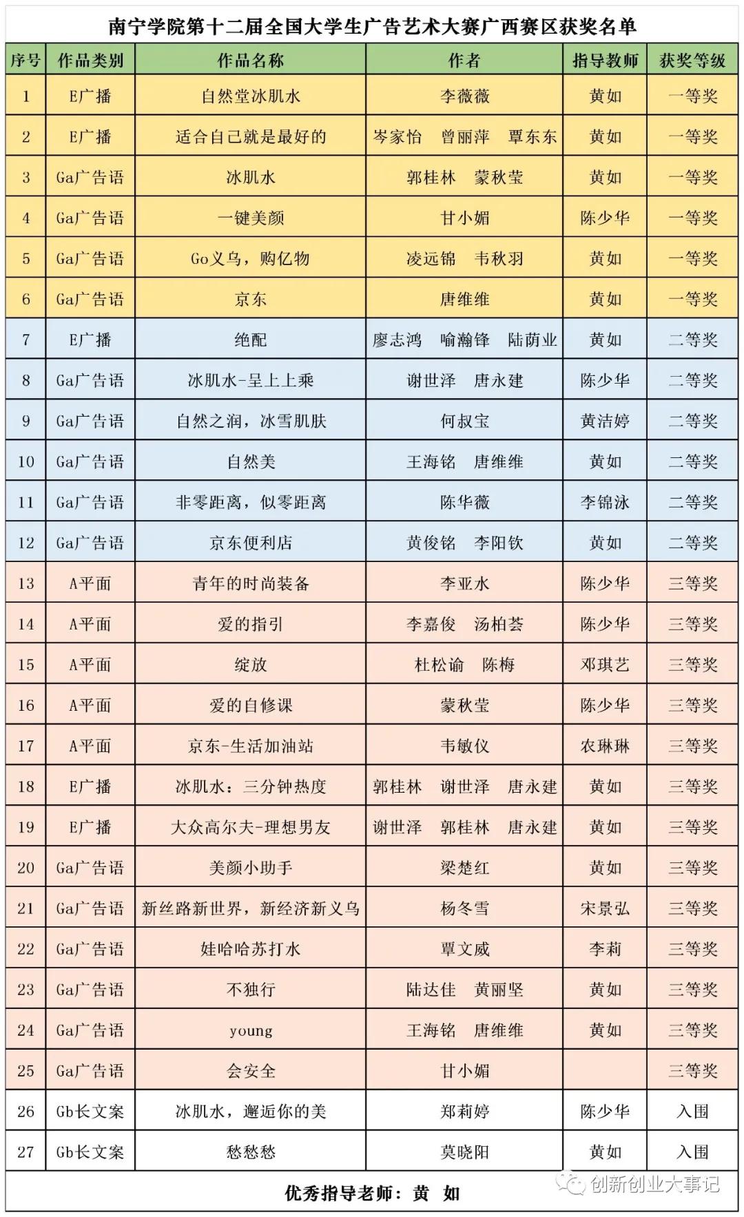 近日,第十二届全国广告艺术大赛广西赛区获奖名单已公布,南宁学院获得一等奖6项、二等奖6项、三等奖13项以及入围奖2项,共计27项,黄如老师获优秀指导教师,为我校学科竞赛成绩又增添浓墨重彩的一笔。