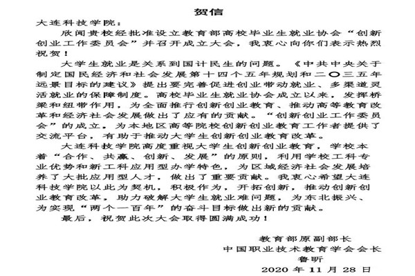 此外,教育部原副部长、中国职业技术教育学会会长鲁昕发来贺信,对大连科技学院经批准设立教育部高校毕业生就业协会“创新创业工作委员会”并召开成立大会表示热烈祝贺。