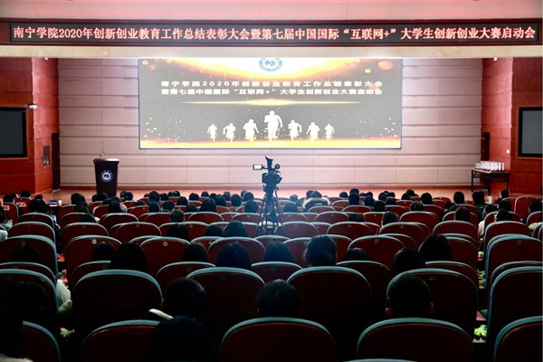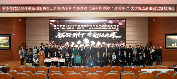 春种一粒粟,秋收万颗子。2021年1月6日,南宁学院2020年创新创业教育工作表彰大会暨第七届中国国际“互联网+”大学生创新创业大赛启动会在图书馆报告厅顺利举行。学校刘彪书记、陈雄章副校长、李陶深副校长、各单位、部门负责人、各二级学院分管实践教学副院长及创新创业工作联络人,金园丁创新创业导师和获奖师生代表们共500余人参加了会议。本次会议由学校覃存民副书记主持。