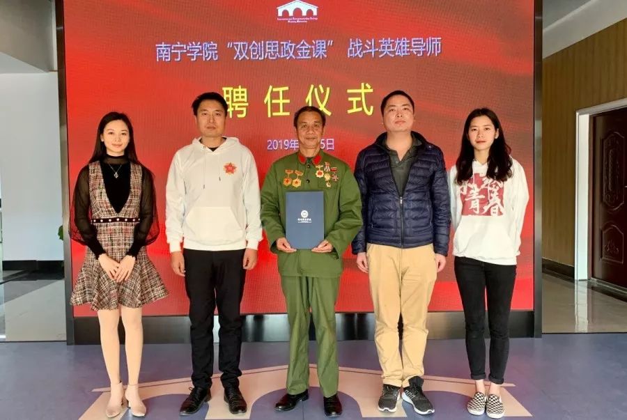 ▲梁盛春老英雄被聘为南宁学院“双创思政金课”战斗英雄导师