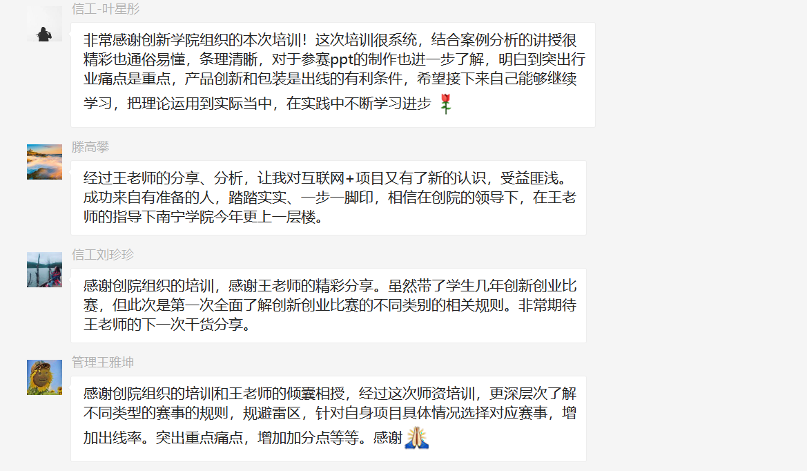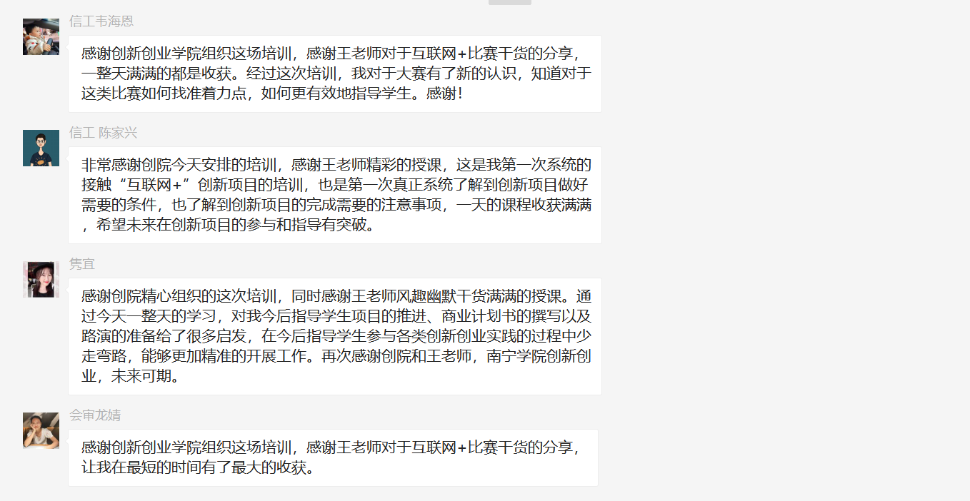 培训过程中,老师们积极思考,主动参与互动,根据自己的实际情况与思考瓶颈提出疑问,王晓明老师结合实例,针对这些问题作了详细的解答,其幽默风趣的讲授风格获得了学员们的一致好评。学员们的热情十分高涨,许多老师纷纷表示此次培训干货满满,收获很大,希望能够通过自己的微薄之力,努力为创新创业教育工作贡献,争取在第七届“互联网+”大赛中取得好成绩。
