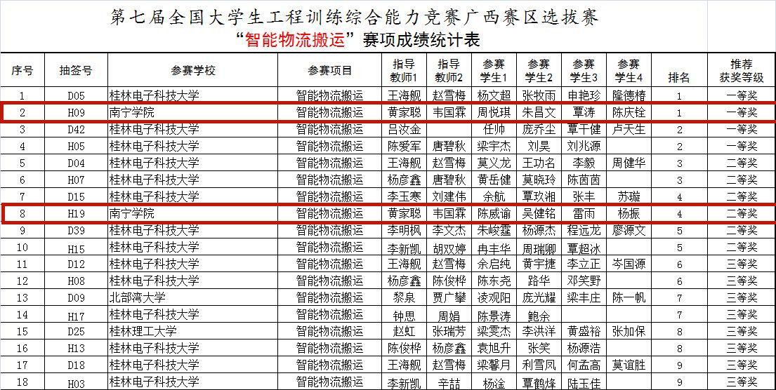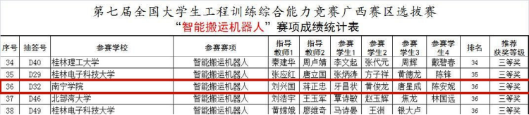 3月28日,第七届全国大学生工程训练综合能力竞赛广西区选拔赛顺利闭幕。此次南宁学院共有13支队伍进入现场赛,经过两天的比拼,最终喜获一等奖2项,二等奖5项,三等奖6项的好成绩!