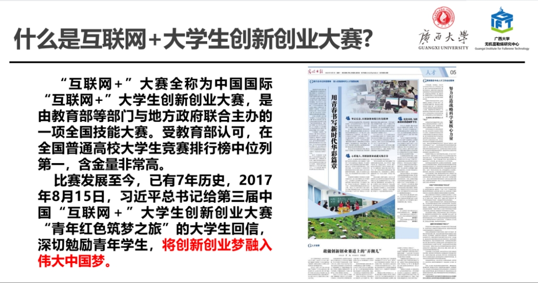 嘉宾王南南博士从“什么是‘互联网+’大学生创新创业大赛”引入,从我国古代修建长城、近代修建铁路以及如今建设大湾区的发展定位分析,引出大赛项目的定位:聚焦国家发展需要,围绕国家发展战略、产业布局,针对行业难点痛点。