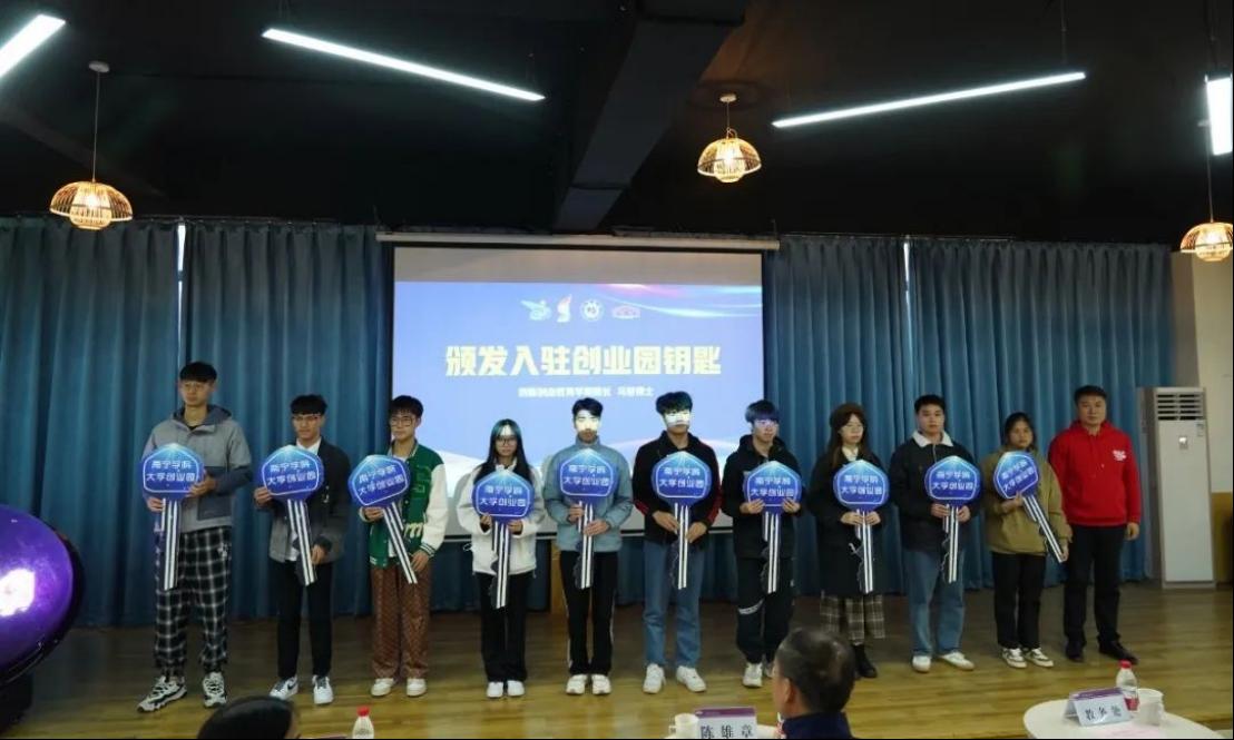 创新创业教育学院马骏院长为新一批入驻创业园的项目学生代表颁发入驻钥匙。