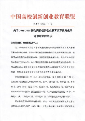 据悉,该评选是由中国高校创新创业教育联盟和中国高校创新创业教育研究中心联合发起,目的为了系统梳理和总结对中国高校创新创业教育深化改革有重大影响的标志性研究成果,探寻中国高校创新创业教育深化改革的有效途径,把握国内外创新创业教育新态势,引领创新创业教育方向,促进国内外创新创业教育交流与合作,为中国高校创新创业教育高质量发展提供参考。