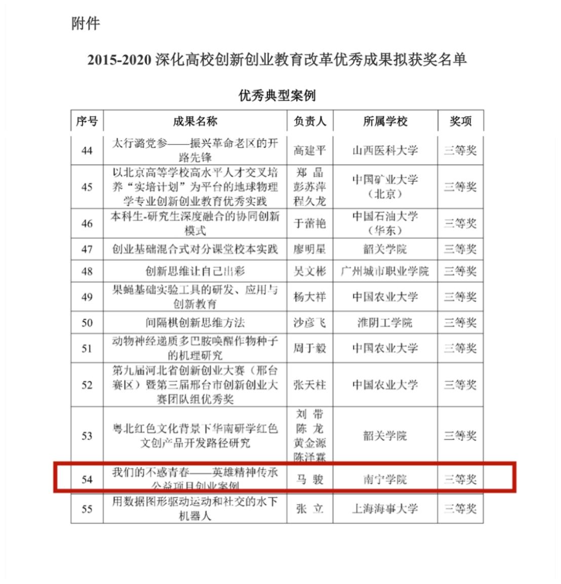 8月10日,由中国高校创新创业教育联盟和中国高校创新创业教育研究中心联合发起的2015-2020深化高校创新创业教育改革优秀成果征集活动公布评审结果,南宁学院《我们的不惑青春——英雄精神传承公益项目创业案例》荣获优秀实践类三等奖。该成果由南宁学院副校长陈雄章教授,创新创业教育学院院长马骏博士、副院长黄如博士,韦林杉博士,邓海贝,李梓昕,罗维长,李梦茹等老师共同完成。