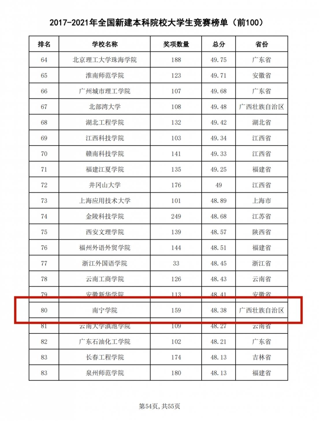 在“2017-2021年全国新建本科院校大学生竞赛榜单”中,南宁学院以48.38分的成绩在同类院校中排名第80位,闯入全国百强!