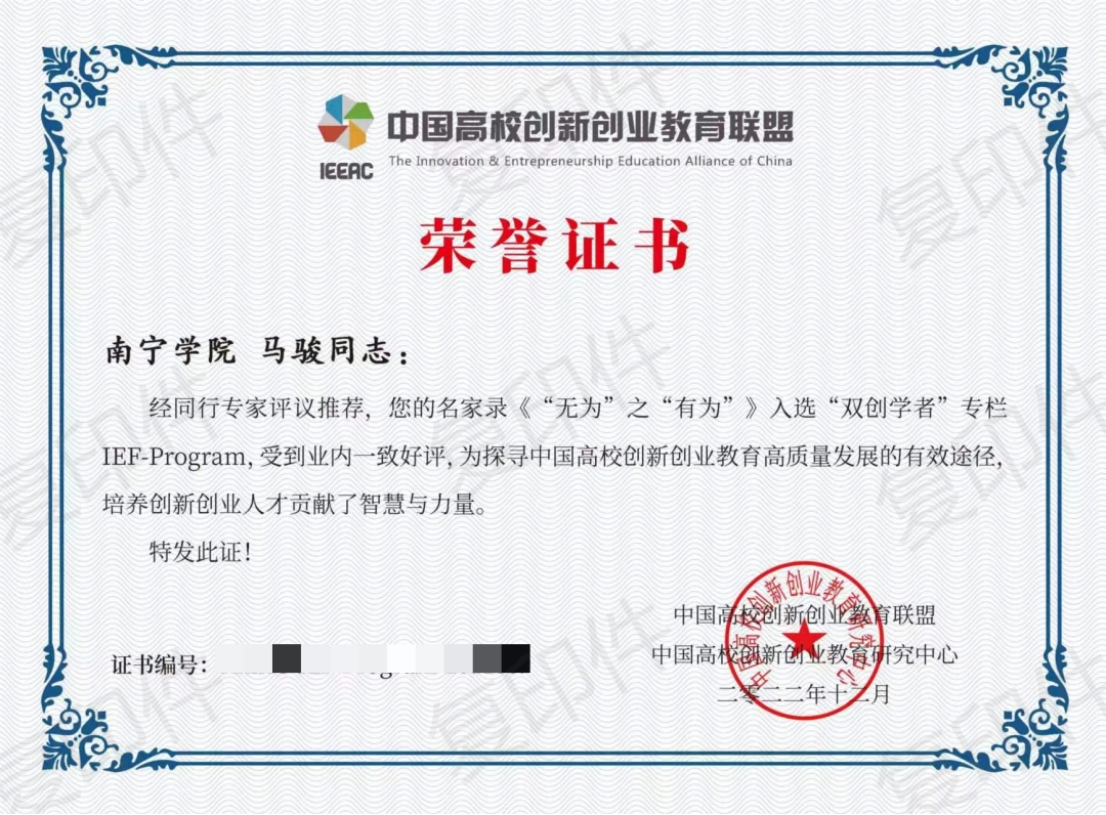 近日,南宁学院创新创业教育学院马骏博士获得中国高校创新创业教育联盟和中国高校创新创业教育研究中心颁发荣誉证书。