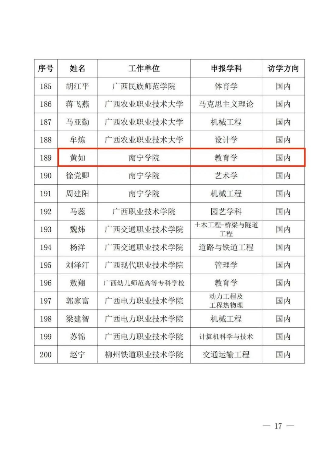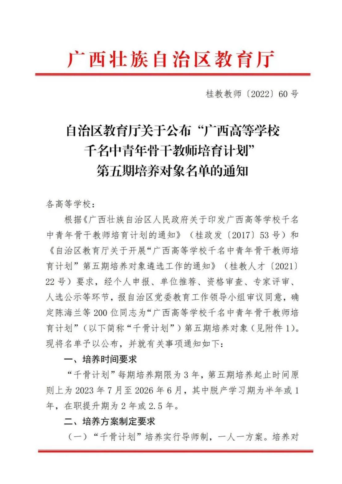 近日,广西区教育厅下发《关于公布“广西高等学校千名中青年骨干教师培育计划”第五期培养对象名单的通知》(桂教人〔2022〕60号),创新创业教育学院副院长黄如博士经过公开选拔、专家评审,成功从全区高校推选的候选人中脱颖而出,入选第五期广西高等学校千名中青年骨干教师培育计划。据悉,我校先后共有4人入选该计划,创新创业教育学院共有2人,其中马骏博士入选首期计划人选。