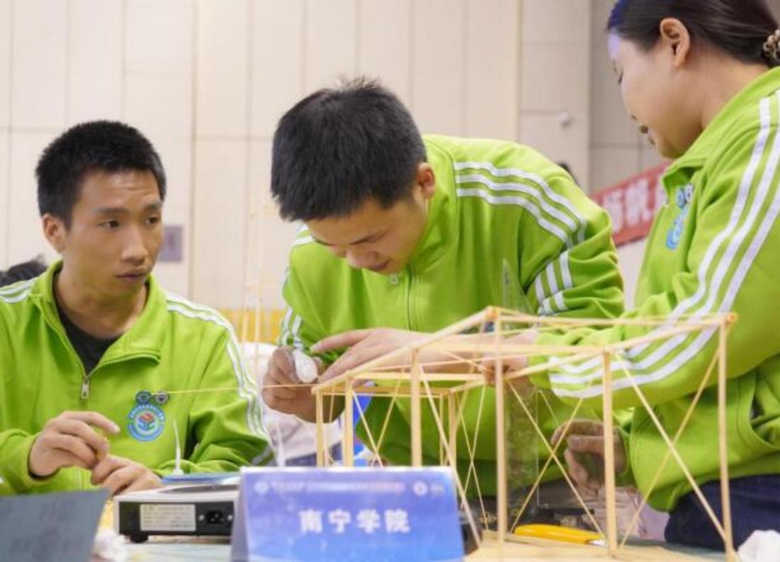 据统计,此次竞赛全国共计超过550所高校、1100支队伍参与了分区赛选拔。我校参赛选手在黄家聪老师和梁小光老师指导下,经过广西分区赛选拔,以广西唯一一所本科高校的身份参加国赛。本次大赛题目模型采用以三重木塔结构为基本单元,要求参赛者针对竖向荷载、扭转荷载及水平荷载等多种荷载工况下的空间结构进行受力分析、模型制作及加载试验。参赛选手需要在模型制作、陈述答辩、模型加载3个环节展开激烈角逐,竞争奖项。