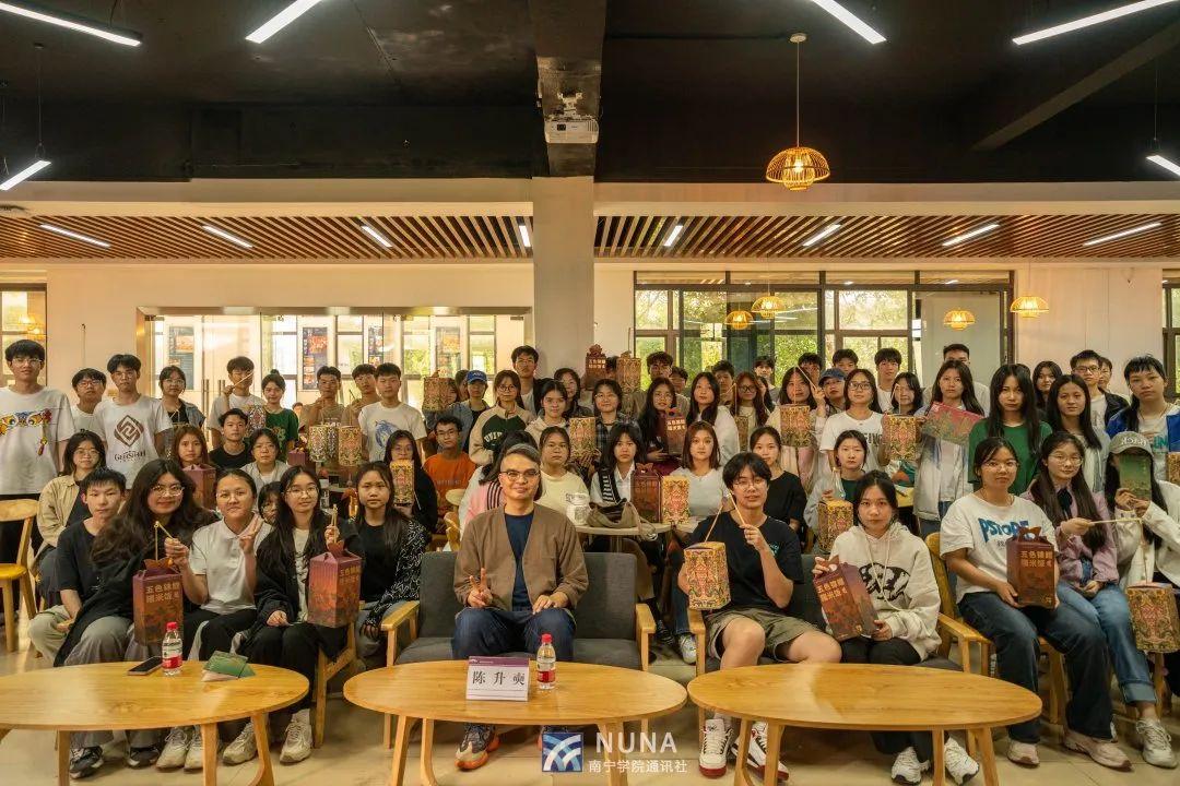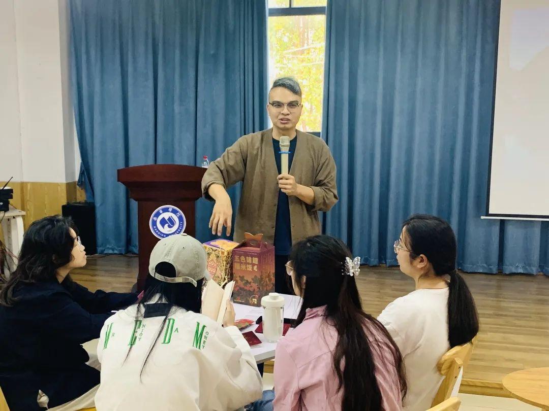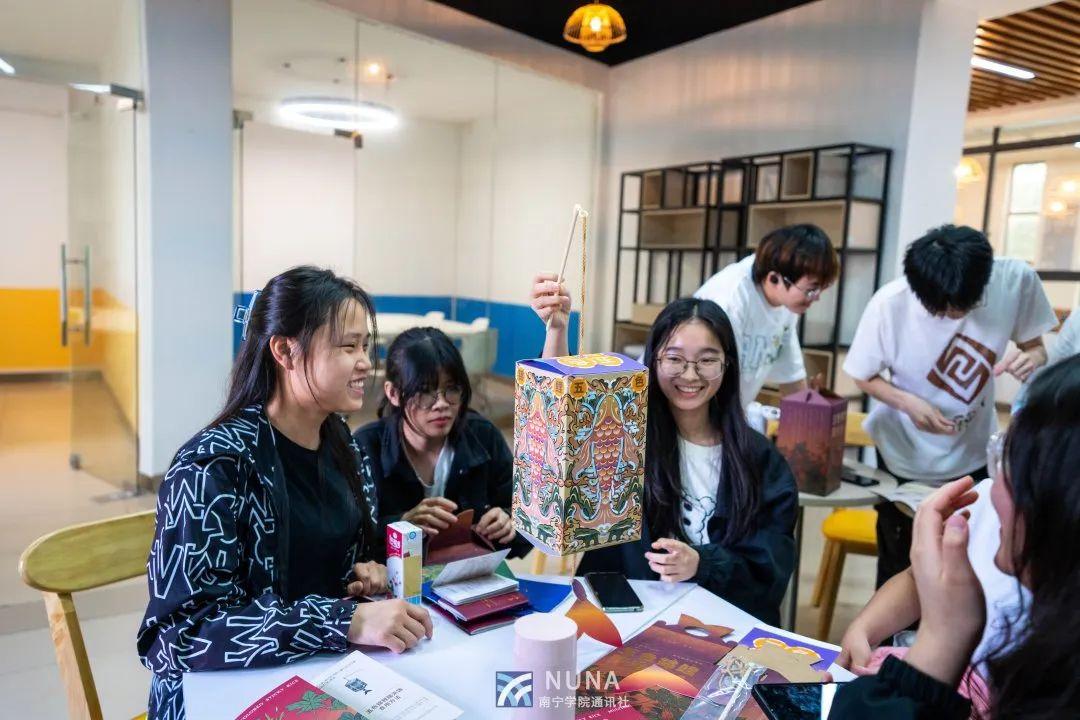 紧接着,陈老师通过图片与现场实物制作的形式展示了其多年来打造的广西“好物”,包括刘三姐皮影戏DIY伴手礼盒、五色锦鲤糯米饭礼盒、一茶一锦六堡茶礼盒、炮龙戏珠礼盒、绣里乾坤春节礼盒等。在场的同学们纷纷称赞陈老师对广西非遗产品的创新设计,并以小组的形式动手制作五色锦鲤糯米饭礼盒和锦鲤灯笼。