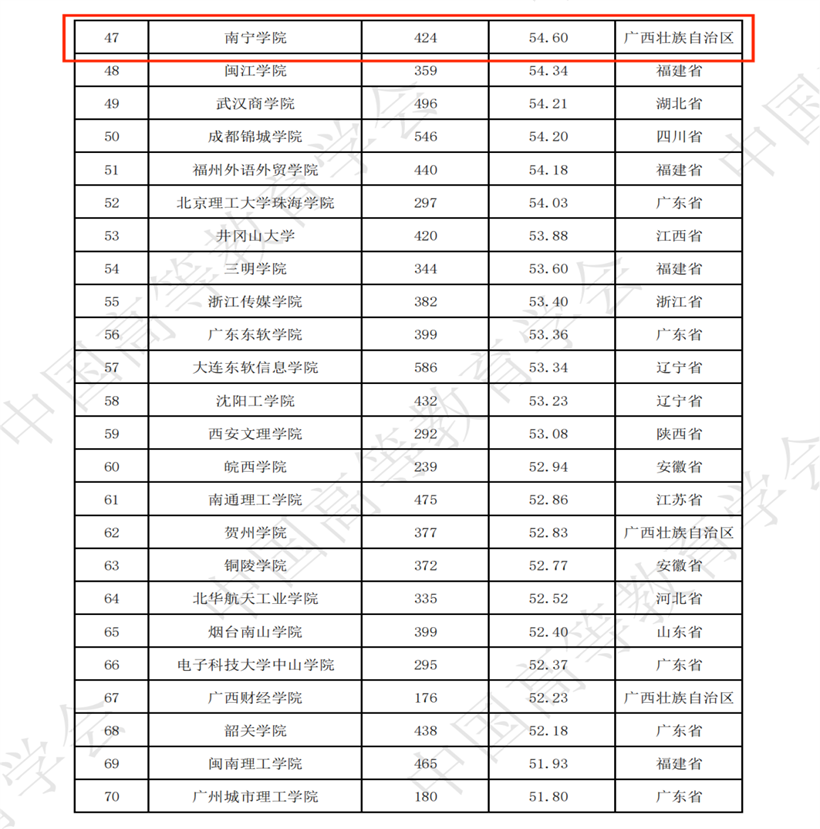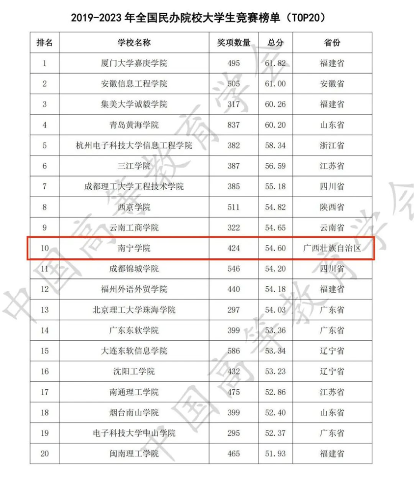 3月22日,中国高等教育学会发布《2023全国普通高校大学生竞赛分析报告》,南宁学院以54.60分的成绩,在全国约700所新建本科院校中,位于“2019-2023年全国新建本科院校大学生竞赛榜单”第47位,比上一年度进步了22位;在全国约450所民办及独立学院中,位于“2019-2023年全国民办院校大学生竞赛榜单”第10位,比上一年度进步了7位!