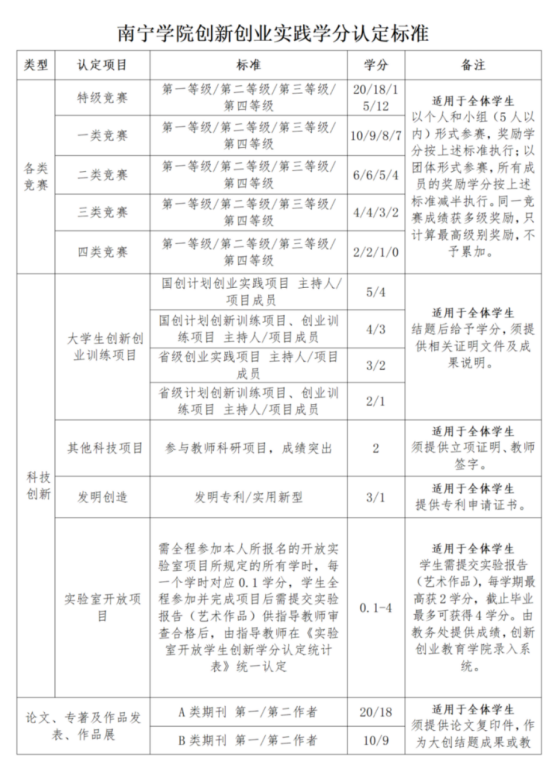 审核通过后,由各二级学院在教务系统进行审核认定,并填报学院的《南宁学院创新创业实践学分汇总表》(详见文末附件)报送至创新创业教育学院备案