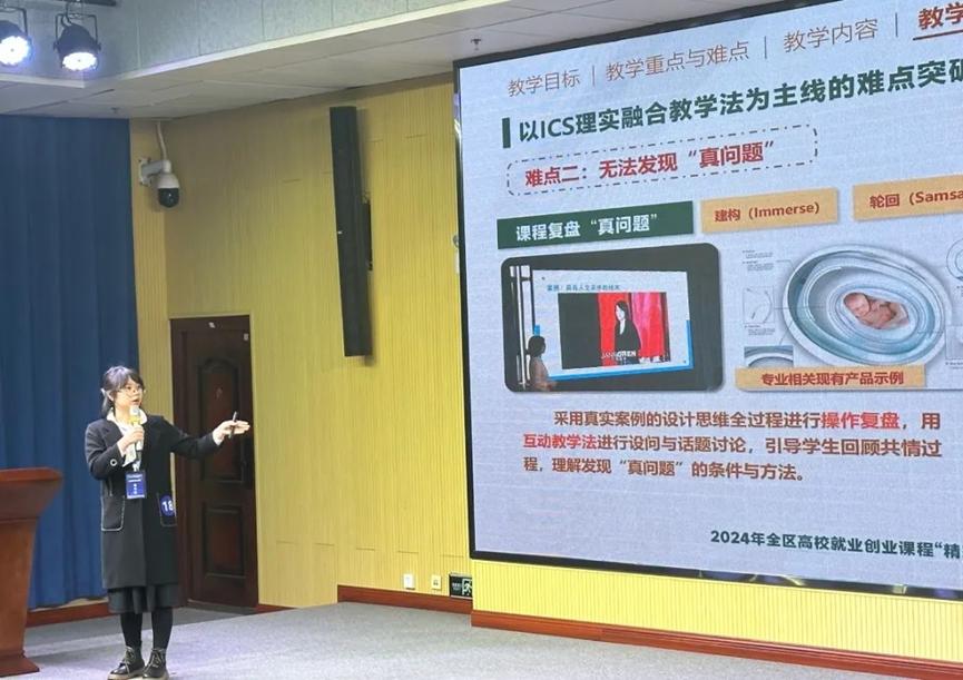 李梓昕老师用“懂你的设计思维”为主题分享了她的课程构思。在本次课程设计中,采用了真实的社会热点话题及案例主题进行情景塑造,让学生沉浸在真实的情境中中完成实践操作,通过理实结合的方式不断巩固轮回,帮助学生内化构建知识体系。本节课设计以应用型人才培养为目的,强化应用能力培养,结合学校教学资源与校企合作基础,实现专创融合一体化,达到创业课的因材施教。