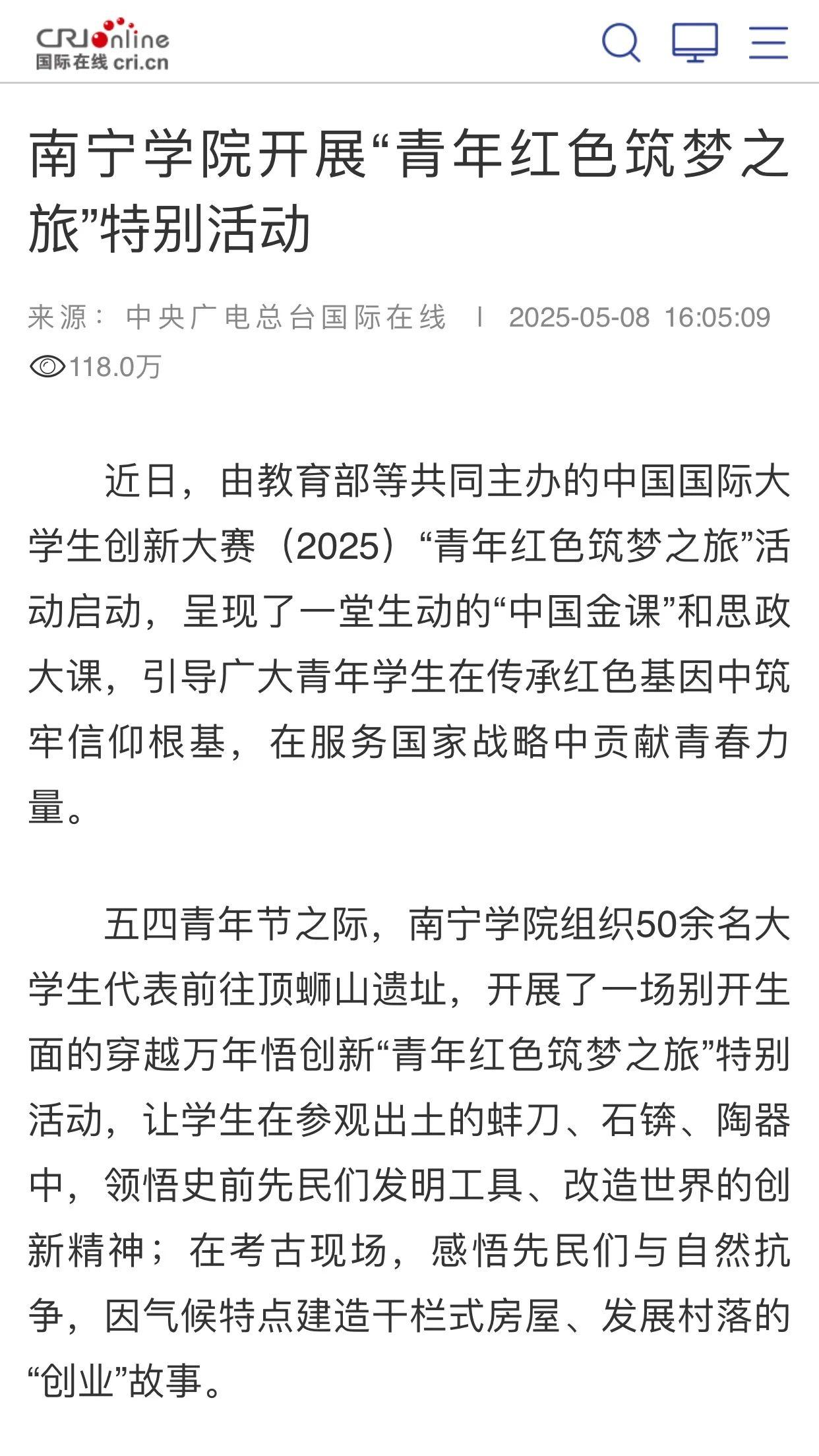 在五四青年节来临之际,南宁学院组织大学生前往顶蛳山史前遗址开展别开生面的“青年红色筑梦之旅”活动。该活动获得了包括中央广电总台国际在线、广西日报等多家主流媒体的报道,截止到2025年5月15日10:00,中央广电总台国际在线客户端的阅读量已突破118万。