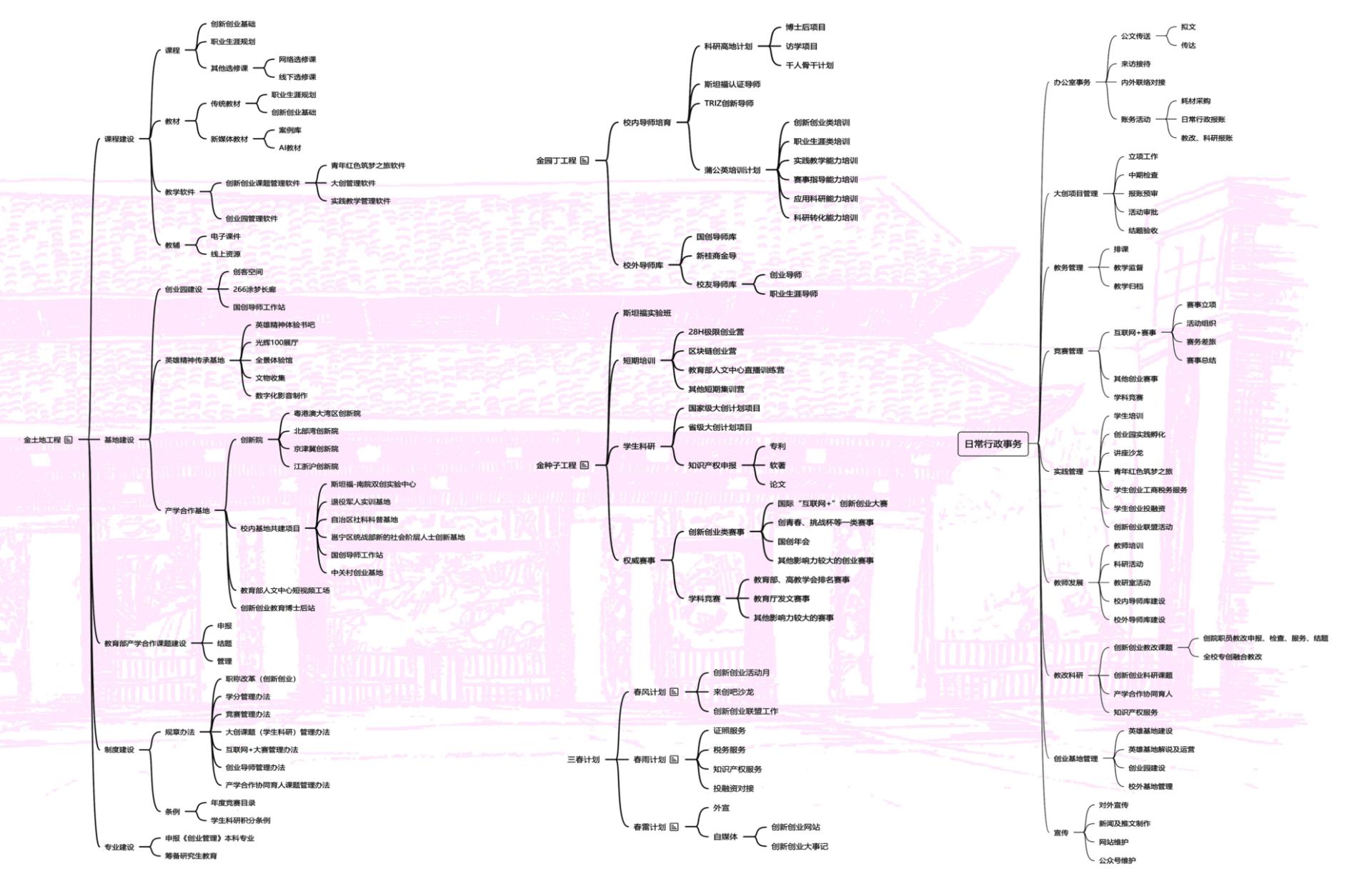 实施“四金工程”(金土地工程、金园丁工程、金种子工程、金气候工程),集中全校资源建立专创融合生态,促进专业交叉,服务四新建设,提升育人质量。例如金园丁工程,组织骨干教师申报专创融合教学改革项目、专创融合教学比赛等多种方式提升教学能力,已培养校内各学科专创融合创业导师187名,引进校外企业导师154名。