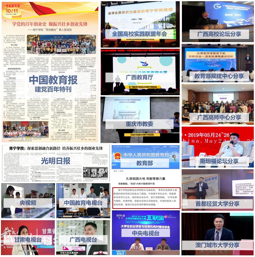 培育出广西十大创业明星等优秀学生,育人成效获得学习强国、光明网、中国教育电视台、央视频、人民网、中央广电总台、腾讯网、广西电视台、广西日报、中国国际大学生创新大赛官网等国家级、省级媒体和刊物报道,入选中国教育报建党百年特刊。获得上级部门认可,学校先后获得首批深化创新创业教育改革示范校、自治区级创新创业学院、大创项目计划实施优质校等称号。