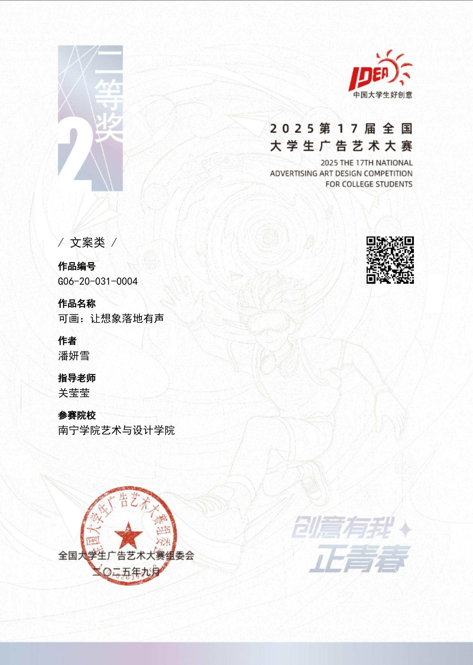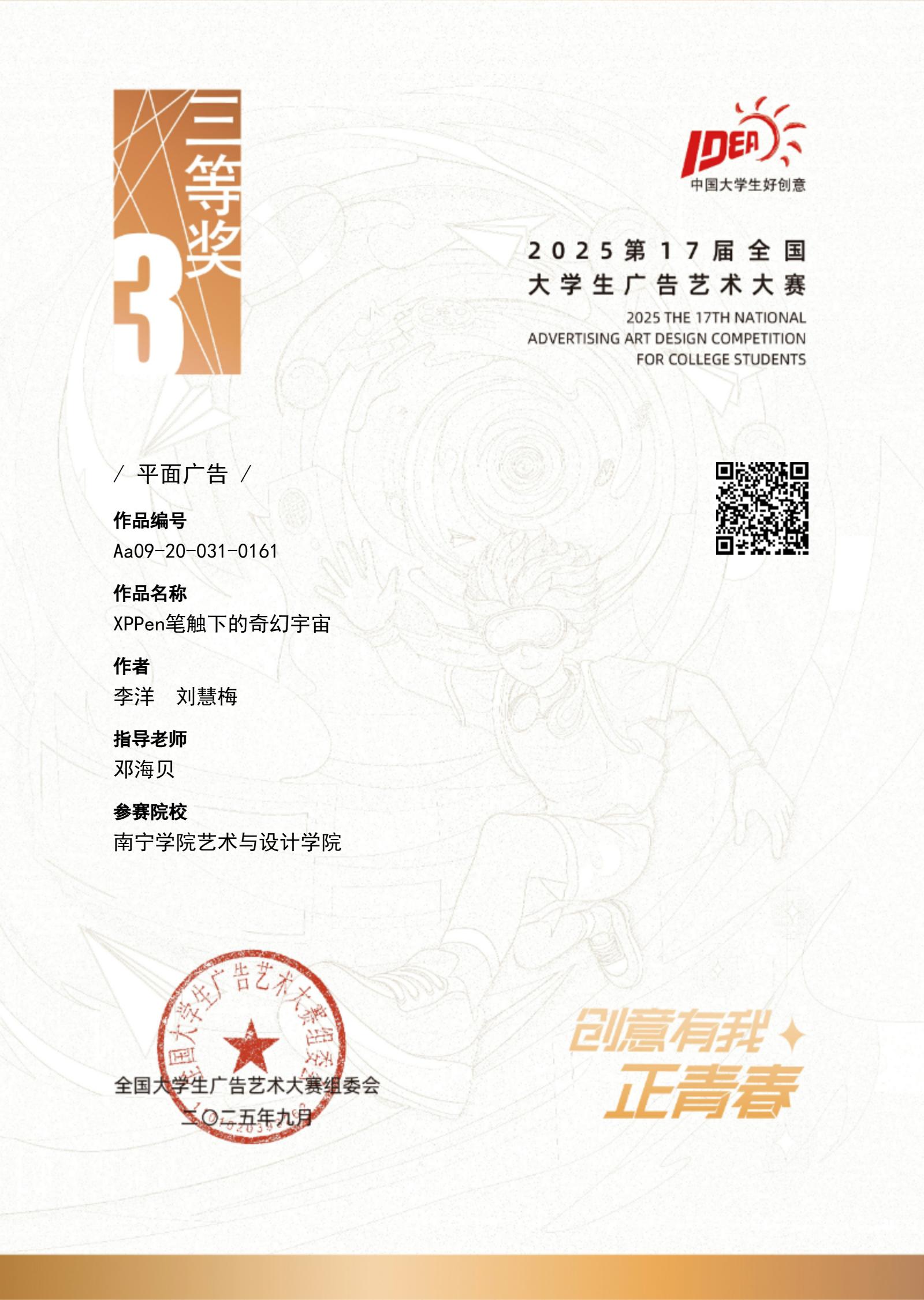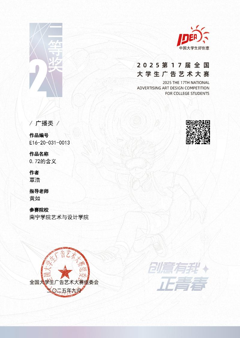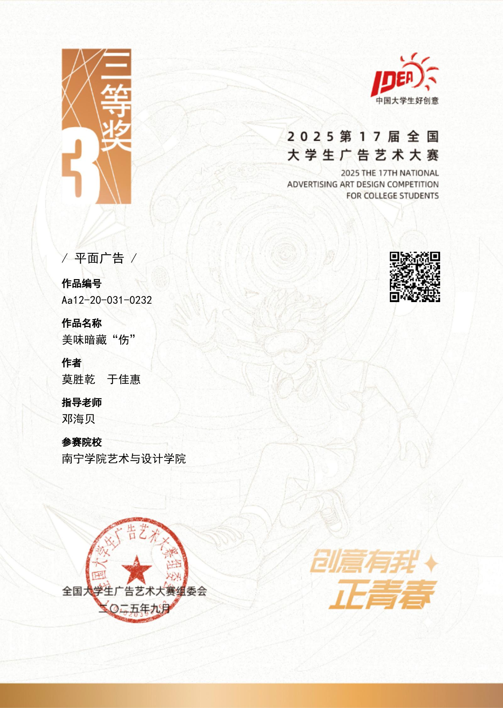 2025年9月,第十七届全国大学生广告艺术大赛获奖名单正式公布。我校师生斩获全国二等奖3项、三等奖2项、优秀奖14项,广西赛区一等奖17项、二等奖38项、三等奖43项。学校以总积分第二的优异成绩获得广西赛区“优秀参赛院校”,黄如、邓海贝、栗莎三位老师均以前五的积分排名获得“优秀指导教师”荣誉称号。