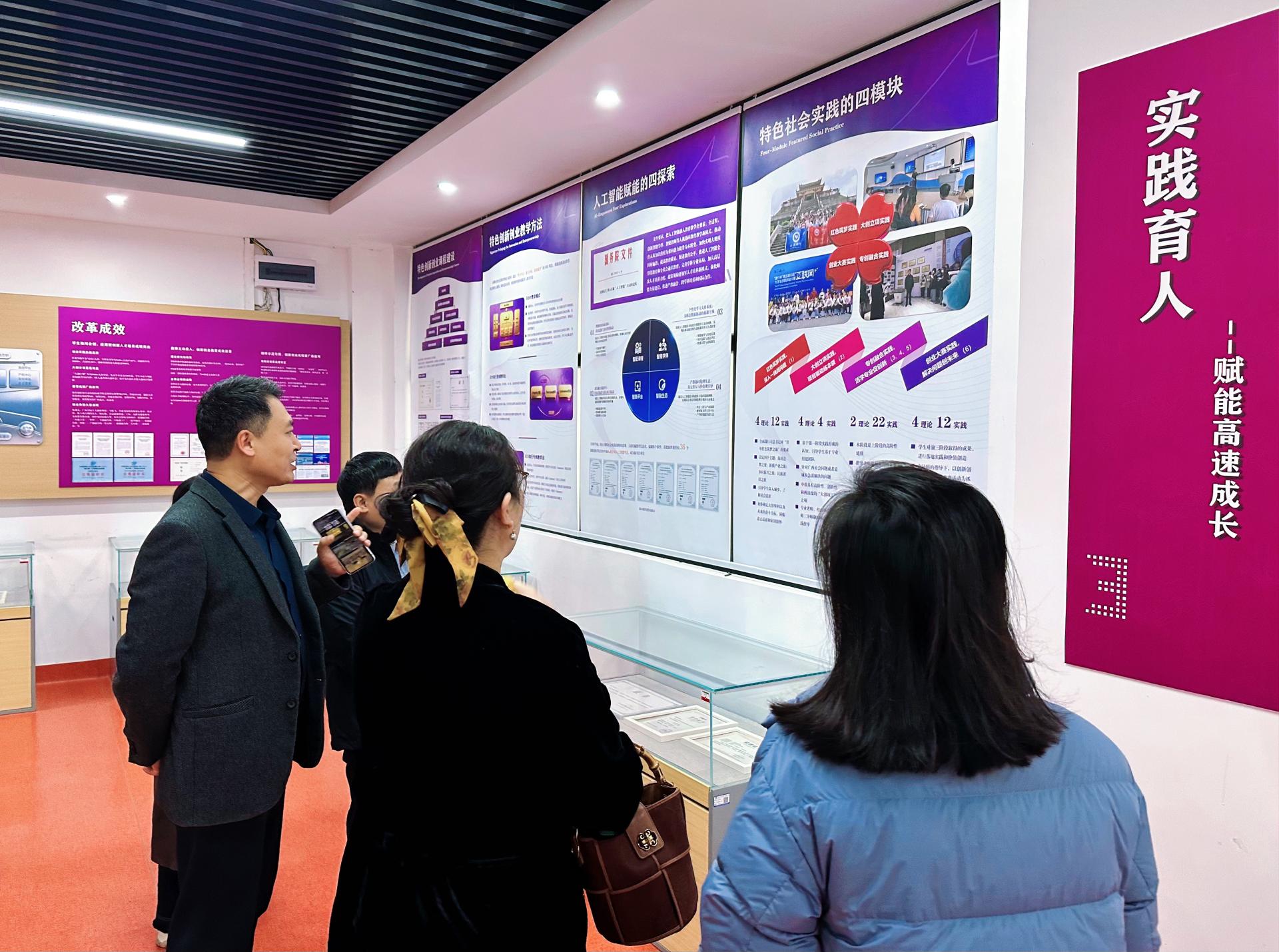首先,韦良副院长一行前往南宁学院创新创业成果展厅参观。解说员李梓昕引导大家依次参观“邕水敷文,庚续千年文脉”“行知范式,践行育人初心”“实践育人,赋能高速成长”“桃李芬芳,彰显最高荣耀”四个展区,详细讲解了我校创新创业教育的发展概况、改革举措及育人成效。