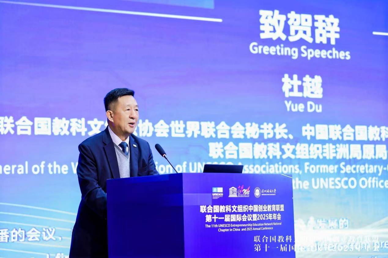 联合国教科文组织协会世界联合会秘书长、中国联合国教科文组织全国委员会原秘书长、联合国教科文组织非洲局原局长杜越致贺词
