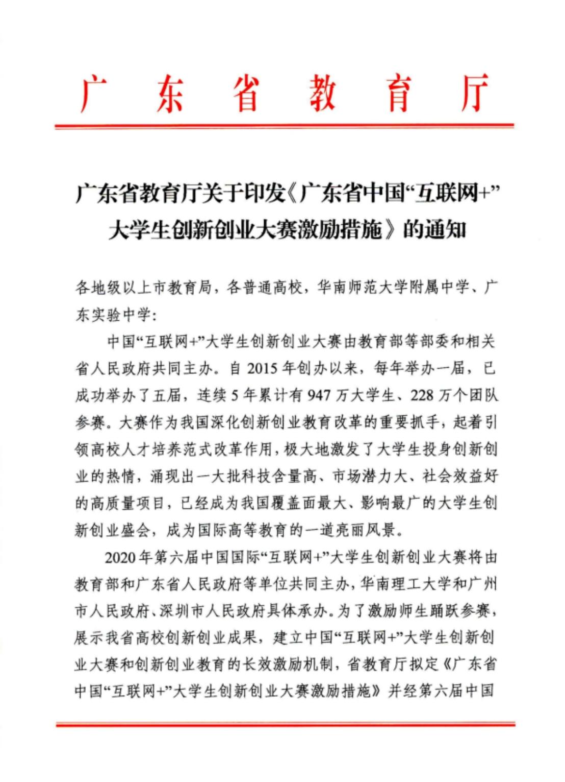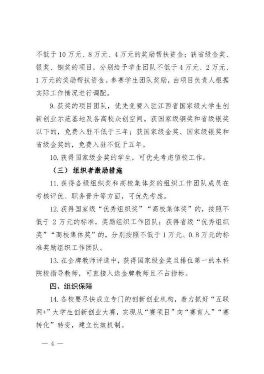 根据《国务院办公厅关于进一步支持大学生创新创业的指导意见》,为深入推进大众创业万众创新,充分发挥中国国际“互联网+”大学生创新创业大赛对创新创业创造人才培养的促进作用,有效激励广大师生踊跃参赛,建立完善“互联网+”大学生创新创业的长效激励机制,特制定以下激励措施。