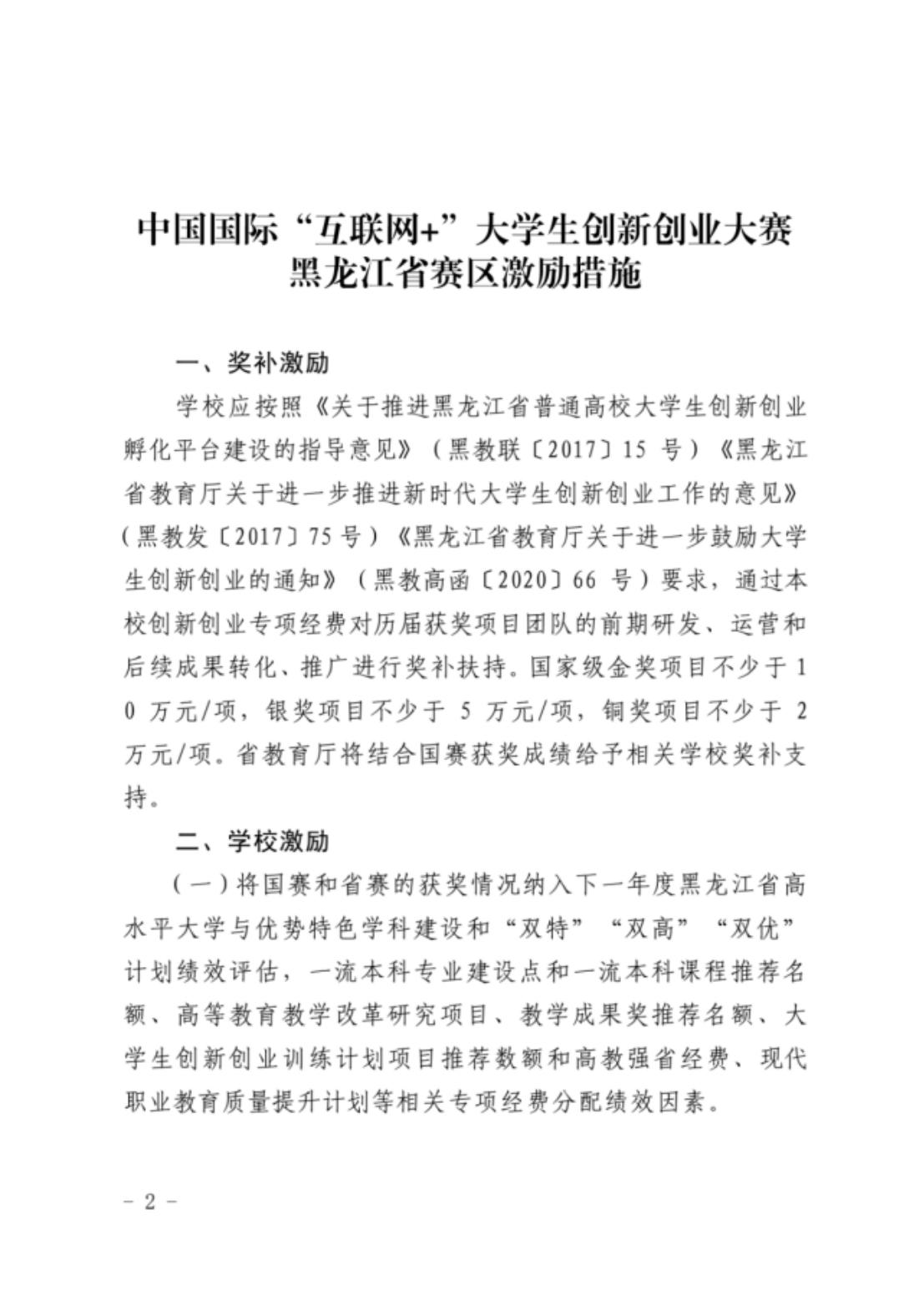 将省/国赛获奖情况纳入黑龙江省高水平大学与优势特色学科建设和“双特”“双高”“双优”计划绩效评估;给与国家级金奖项目不少于10万,银奖不少于5万,铜奖不少于2万元的奖励;研究生参赛获奖应计入科研成果及学位考核范围,本科生获省赛金奖及以上,可用获奖成绩申请学位论文答辩,省铜及以上奖励可用获奖成绩申请学分认定。