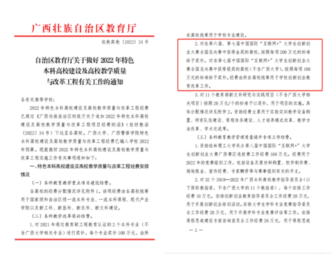 广西壮族自治区教育厅对在中国国际“互联网+”大学生创新创业大赛中获得全国金奖的高校,按照每项