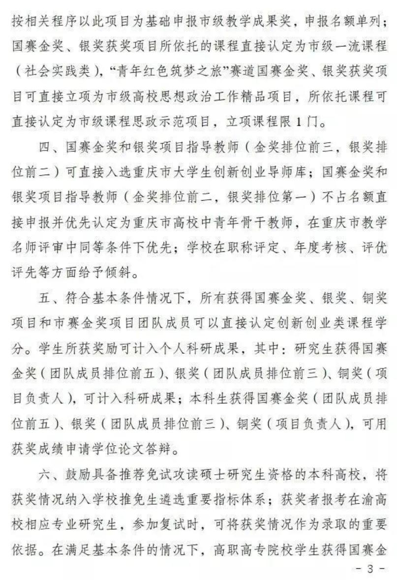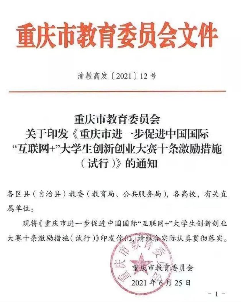 关于印发《重庆市进一步促进中国国际“互联网+”大学生创新创业大赛十条激励措施(试行)》的通知