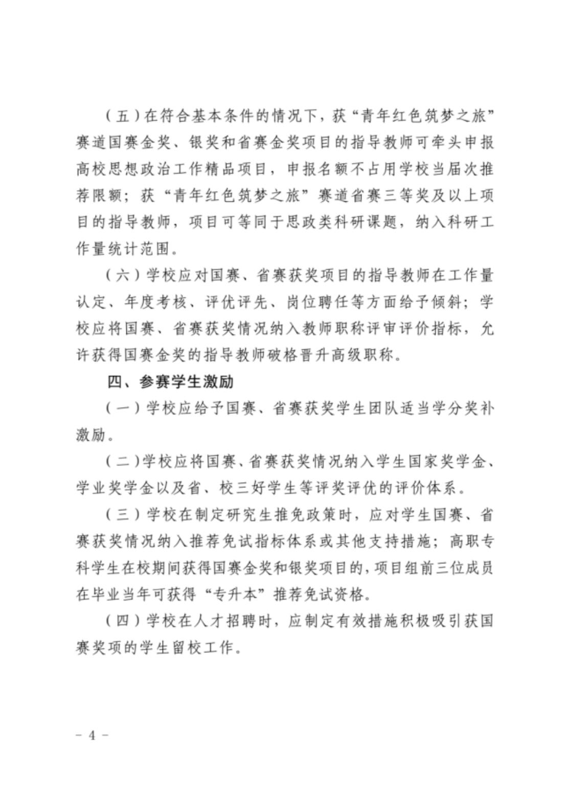 (三)在符合基本申报条件的情况下,国赛金奖项目指导教师(排位第二)、国赛银奖项目指导教师(排位第一)作为主持人或第一完成人,以该项目相关成果申报项目,可在自获奖通知发布之日起两年内享受以下激励政策:不占名额申报省级本科高校教育教学改革研究一般项目、省级中青年教师教育科研项目、省级本科课程(创新创业类)、省级课程思政示范项目或省级高校思想政治工作精品项目(“青年红色筑梦之旅”赛道获奖项目)各1次。