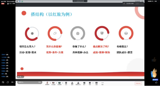 培训开始,杨波老师从“为什么”、“怎么做”、“如何做好”三个层面解析了青年红色筑梦之旅赛道中的规则要点。他表示,“受教育”、“长才干”、“做贡献”,是“青年红色筑梦之旅”活动中的关键词,需要在活动与项目中体现红色情怀与红色精神;在做项目时,需要找准学校特色与优势,注重育人成果,充分开展实践活动,这样才可能挖掘出好的“红旅”项目。讲座内容丰富,干货满满,同学们在听讲过程中纷纷发表感想,表示收益颇丰。