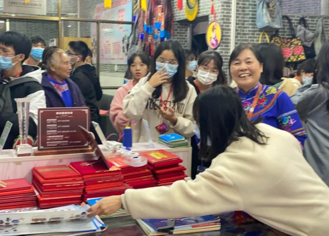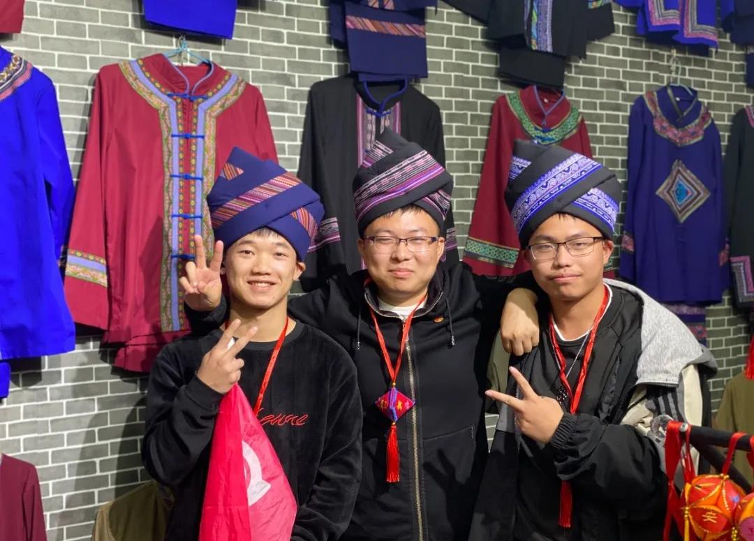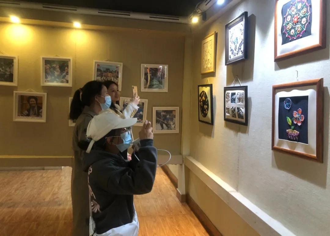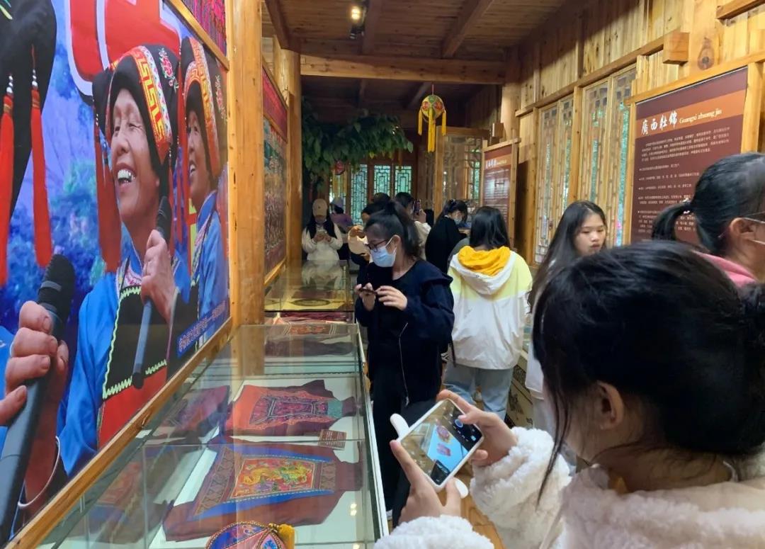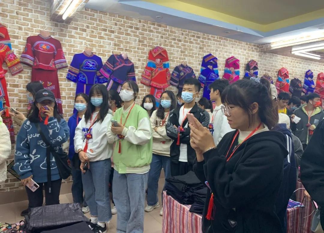 手工坊里充满着各种彩绣作品,囊括了手工绣球、壮族服饰、壮族土布、壮锦、壮族背带头巾、刺绣饰画等。在这里,大家感叹彩绣的精美,试戴手工艺品,有的同学主动聊起继承非物质文化遗产,陆奶奶和其他绣娘欢迎大家拜师学艺,一起把壮族彩绣技艺传承下去。同学们在现场纷纷讨论和思考:我们怎样才能更好地传承这一传统技艺?