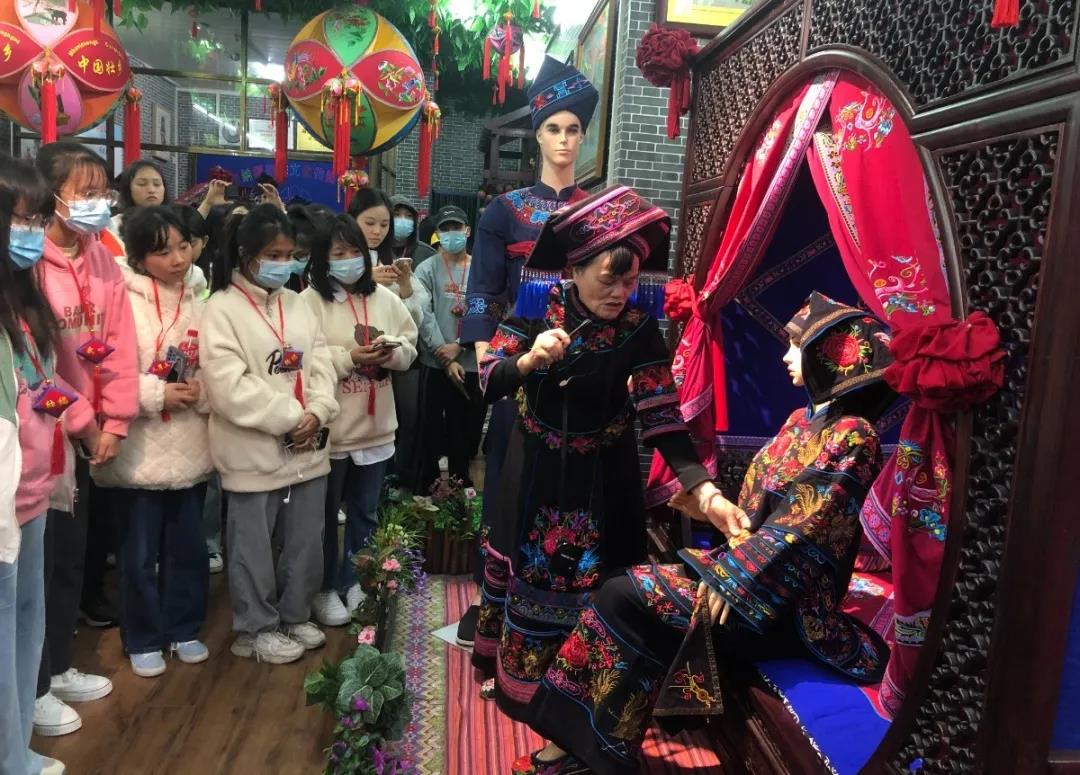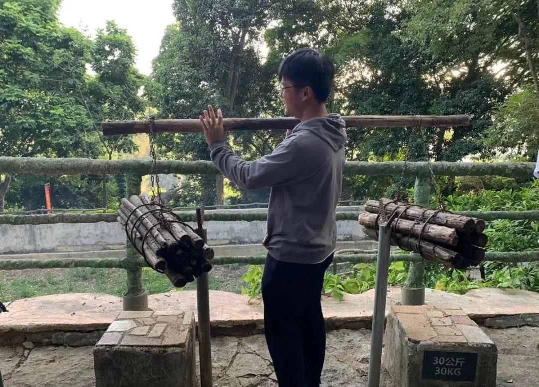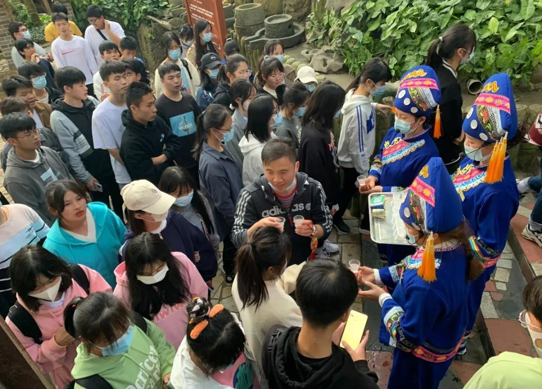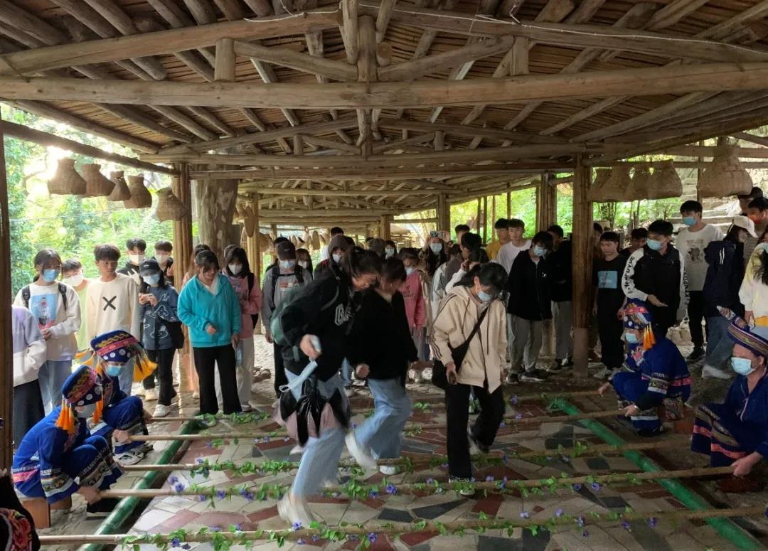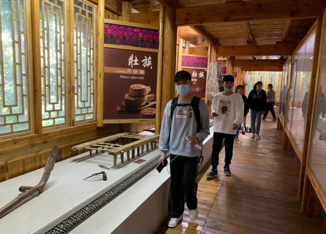 第三站,大家带着前置问题“壮族有哪些民俗文化”,去参观壮文化大观园。进门后首先看到的是壮族的图腾,进入寨门就响起高锐喜庆的啰咧曲子,啰咧就是唢呐,唢呐迎宾客到来是主人对宾客的崇高礼遇。之后大家体验了跳竹竿、对山歌、品尝壮乡酒,亲身感受到了壮乡的文化和风俗。最后大家在展厅里参观了壮族人民的服饰、农具、手工艺品等,也看到了壮族的酒坊和壮乡起源的传说,大家对壮族的发展和文化有了深入了解。