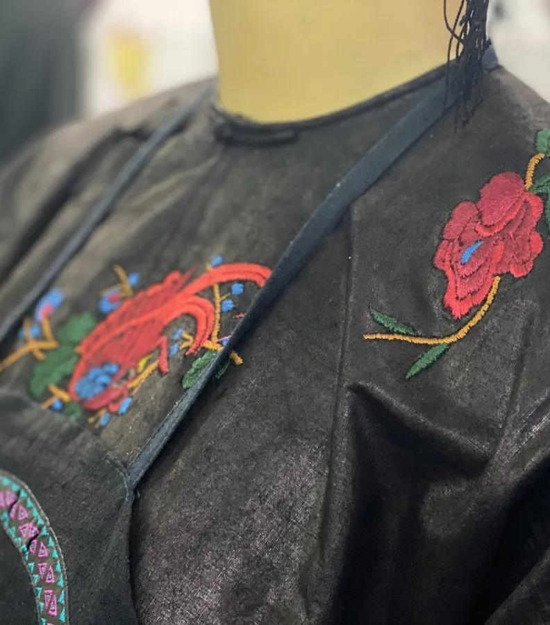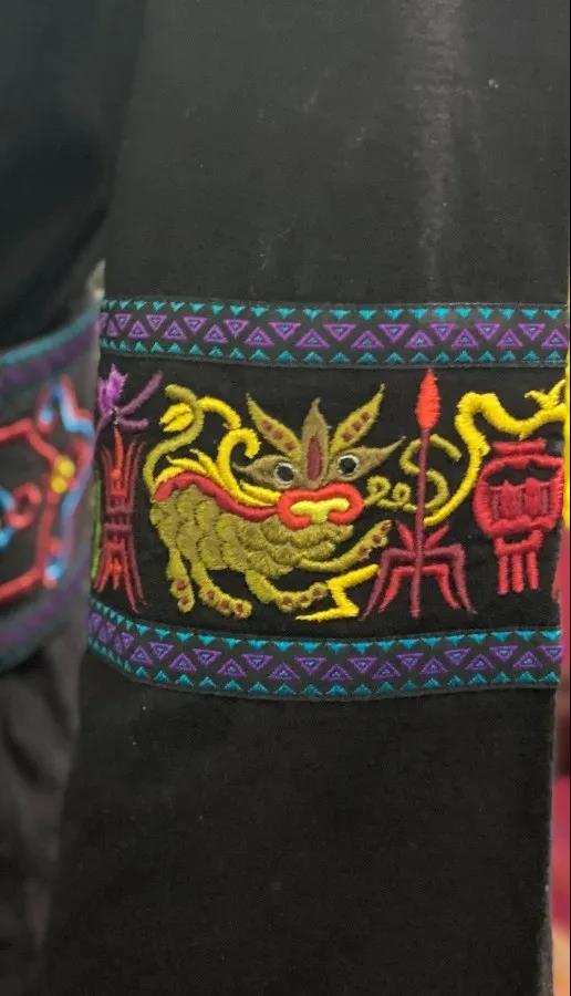 南宁学院学生的到来让她非常开心,她兴奋地给大家介绍彩绣的手艺和作品。刺绣对针法有严格要求,绣线颜色的选择也非常重要,布料以蓝色土布为主,刺绣颜色多是红、绿、蓝等鲜艳的颜色。一楼展厅里展示的一套名为骆越新娘的改良版壮族服饰,是陆兰珍团队的得意作品之一,该作品以红色为底色,在衣服上绣有龙凤、花朵,绣线密集,看起来非常精美。为了创作这套骆越新娘服,她的团队花了一年多的时间。