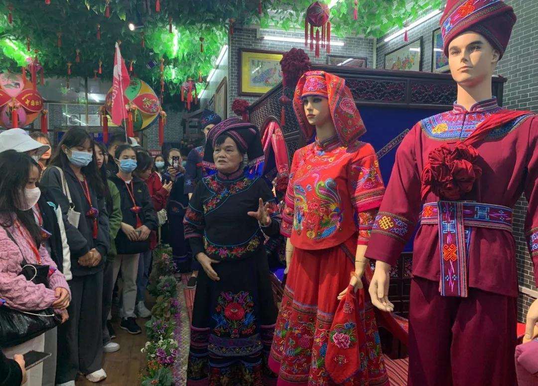 第五站,同学们来到南宁市非物质文化遗产代表性项目武鸣壮族服饰传承基地的纳福彩绣手工坊。武鸣传统壮族服饰及彩绣工艺的第四代传承人陆兰珍,今年已经70岁了,她经常为武鸣壮族传统服饰及彩绣工艺的创作和传承而奔忙着。