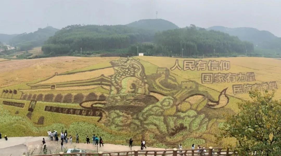 稻花香里说丰年,听取蛙声一片。如今中国是世界水稻产量最高的国家,秋收之际黄澄澄的稻穗汇成了金色的海洋。第二站,同学们来到了古辣稻田,感受着乡村的新面貌。登上玻璃栈桥,一副巨大的百年华诞稻田艺术画完整的印入眼帘,大家被劳动人民的智慧所折服,原来农作物也可以玩出艺术范儿!