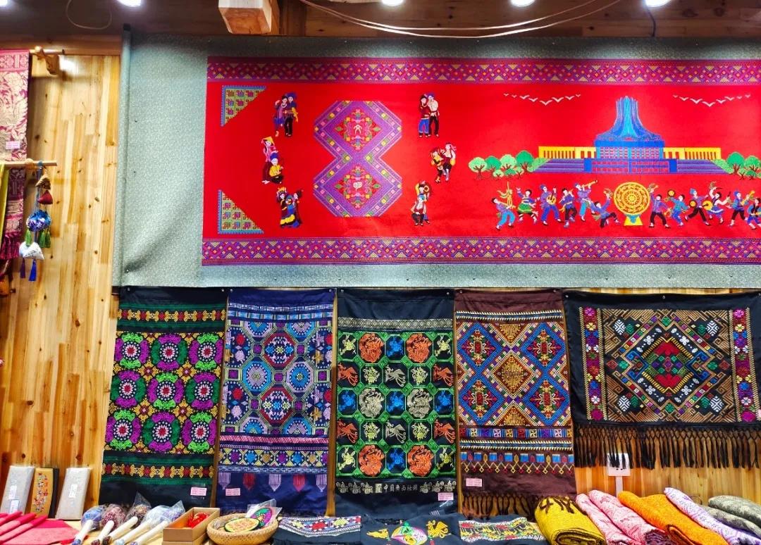 壮锦与云锦、蜀锦、宋锦并称中国四大名锦,中国壮族传统手工织锦,是中华民族文化瑰宝。最后一站是壮锦湘光纺织。无数条锦线在纺织机上悬挂,也被纺织工人无数次拨动。同学们认真聆听着中国中国工艺美术大师、织锦工艺大师、广西非物质文化代表性传承人谭湘光大师介绍普及壮锦知识,从一楼纺织机到二楼纺织工坊再到三楼壮锦展示厅,一丝一线皆为匠人之作。为打破壮锦“土气”的刻板印象,让更多的年轻人关注并爱上壮锦文化,织锦坊开发了很多时尚的壮锦元素单品,时尚的壮锦真皮包包、娇憨可爱的小牛公仔、精致小巧的耳环……这些工艺品全都融入了壮锦元素,传统精湛的技艺与现代美学的艺术设计相互碰撞出灿烂的火花。