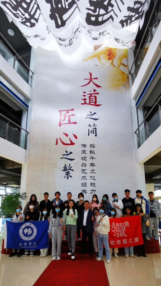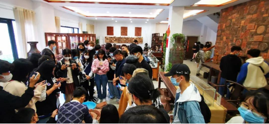 钦州坭兴陶是中国四大名陶之一,坭兴陶烧制技艺被列为国家级非物质文化遗产。在坭兴陶博物馆里,同学们了解了坭兴陶的制作流程、发展历程等知识,看到了许多精美的、富有历史价值的坭兴陶作品。著名坭兴陶制作大师、中国工艺美术大师——利成世大师亲临现场指导。他肯定了我们的“红旅”社会实践活动,对学生给予了殷切期望,希望同学们在此次钦州实践中了解坭兴陶的文化历史,通过创新的方式将广西非遗文化更好地传承。在参观末尾,同学们纷纷与大师合影留念。