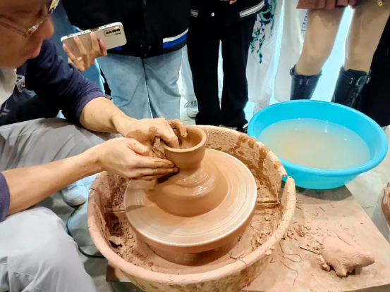 随后,利成世大师带领团队参观了坭兴陶小镇。小镇作为现代坭兴陶产业的代表性地点,坐落着众多工艺美术大师们的工作室。一件件精巧的坭兴陶文创产品,展现了大师们精湛的技艺,也体现了现代社会快速发展下的坭兴陶生生不息的生命力与可塑性。同学们走走看看,对坭兴陶产业现状有了初步的了解,部分同学亲手体验了坭兴陶制作过程。