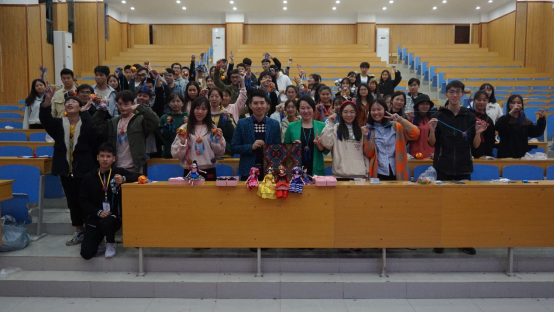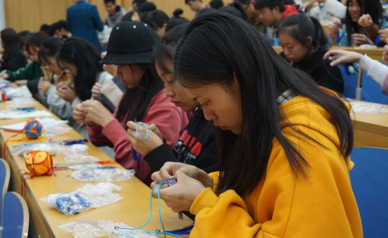 在讲座的前半部分,梁老师通过精彩故事和丰富的图片资料分别从壮锦简介、壮锦起源、壮锦特点、分类以及壮锦用途、发展方面进行讲授。除此之外,梁老师还结合他参加2019年9月中国梦+青年力量广西青年创业创新大赛总决赛获创意组冠军的经历与参加活动的师生分享壮锦文创产品创新创业项目运营的经验,梁老的精彩分享获得了师生们阵阵掌声。讲座的后半部分,梁老师组织参与活动的师生进行了壮锦文创产品的制作体验。在体验活动过程中,梁老师手把手指导大家制作壮锦香囊、壮锦绣球以及具有广西民族特色的壮锦娃娃。参与体验的师生们纷纷表示传承传统工艺的不易,同时也体验到了创新民族工艺的乐趣。