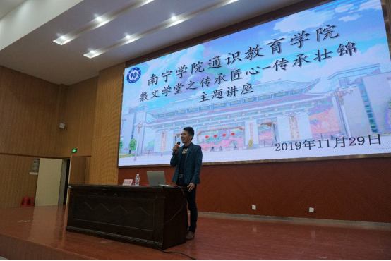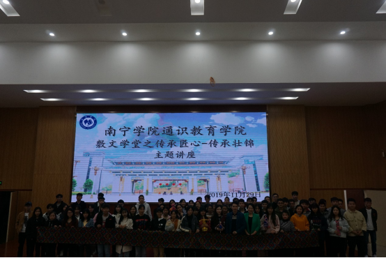 11月29日晚,南宁学院通识教育学院在大学生活动中心103室校友之家举办敷文学堂之传承匠心传承壮锦主题讲座。本次讲座邀请到土司家第26代壮锦传承人,广西自治区非物质文化遗产项目(忻城壮族织锦技艺)代表性传承人,广西文化产业协会振兴传统工艺专家委员会常务理事梁恒源先生主讲。通识教育学副院长蓝志军副教授、美育教研室主任樊原朱老师、教务科干事邱雅玥老师、机电与质量技术工程学院辅导员陈园园老师以及100余名学生参加了本次活动。