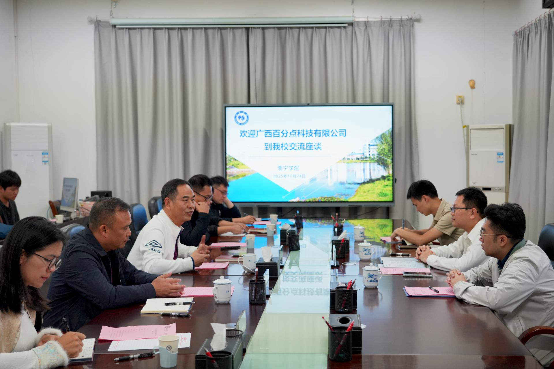 10月24日下午,广西百分点科技有限公司一行到访学校,双方在行政楼518会议室举行交流座谈会,围绕校企合作平台搭建、产学研协同发展深入沟通,赋能区域数字经济发展。校长李栋学、发展规划处处长覃凤彩、副处长李隽宜、信息化处处长沈艺敏、人工智能学院领导班子、各科室负责人及博士教师代表共同参会。副校长龚击主持会议。