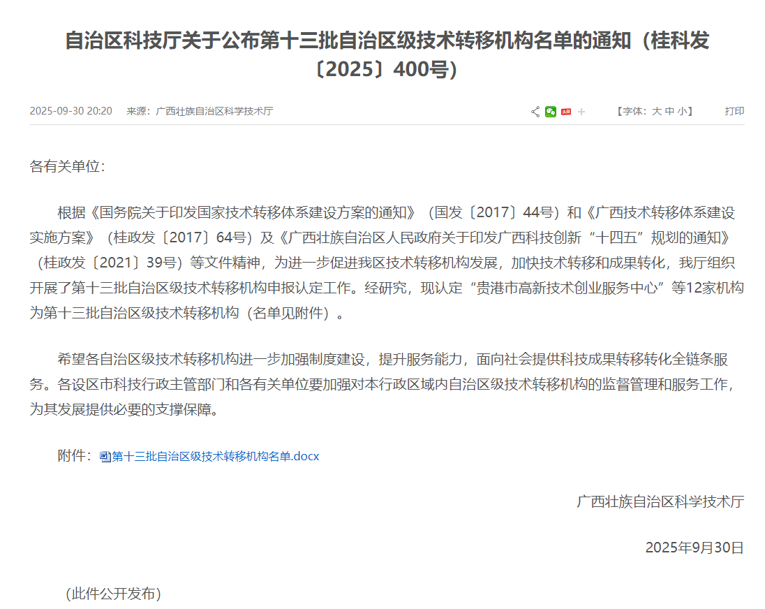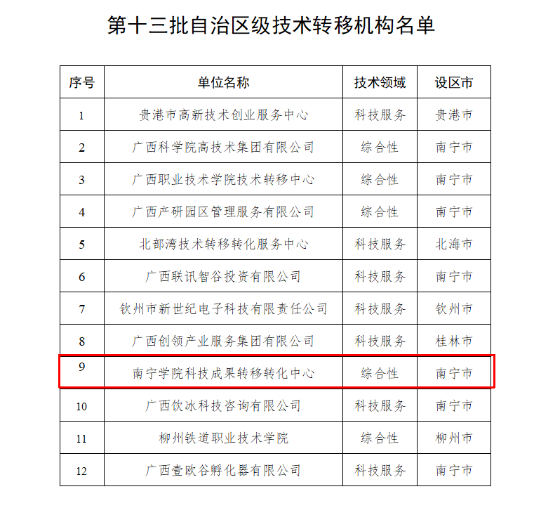 近日,根据《自治区科技厅关于公布第十三批自治区级技术转移机构名单的通知》(桂科发〔2025〕400号),南宁学院科技成果转移转化中心被认定为第十三批自治区级技术转移机构。