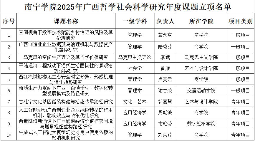 近日,经自治区党委宣传部批准,广西哲学社会科学工作办公室公布了2025年广西哲学社会科学研究年度课题立项名单,南宁学院获批立项10项,立项数再创新高!展现了学校在哲学社会科学领域日益增强的科研实力与创新活力。