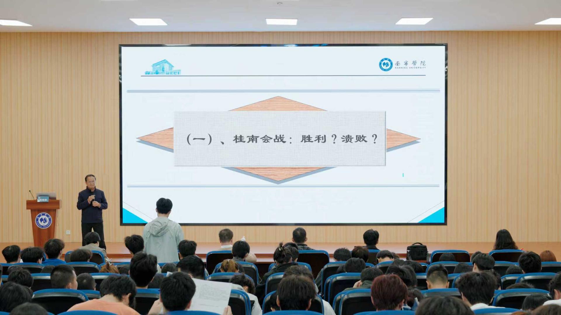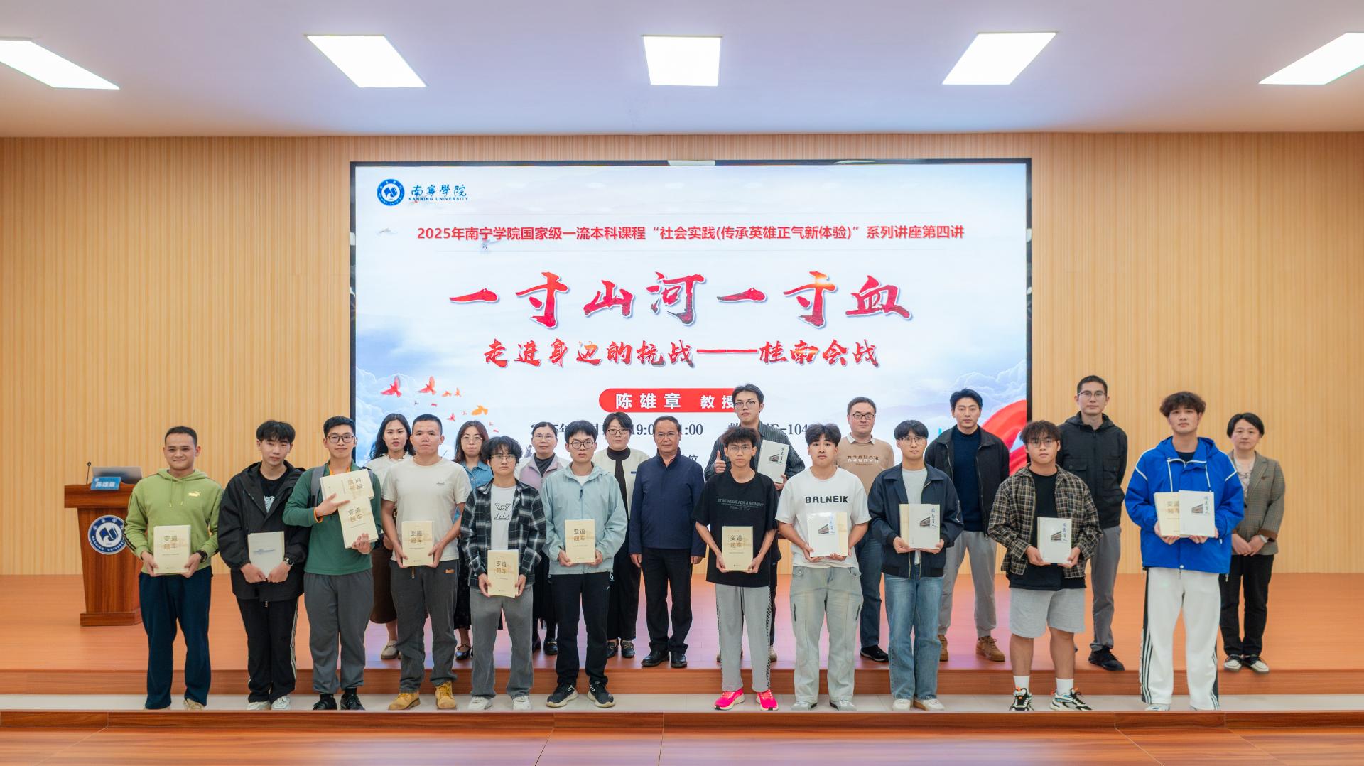 2025年是中国人民抗日战争暨世界反法西斯战争胜利80周年,桂南会战作为抗日战争中极具战略意义的战役之一,见证了广西军民浴血奋战、保家卫国的壮阔历程。为传承红色基因、夯实严谨学风,引导师生从身边抗战历史中汲取精神力量,11月10日晚,南宁学院国家级一流本科课程“社会实践(传承英雄正气新体验)”系列讲座第四讲“一寸山河一寸血 走进身边的抗战——桂南会战”在敷文园E-104报告厅顺利举办。
