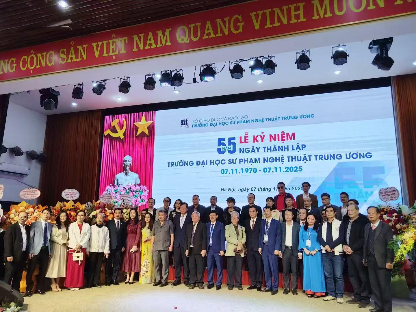 2025年11月5日至8日,南宁学院应邀赴越南中央艺术师范大学(National University of Art Education, NUAE)参加该校建校55周年庆典暨国际艺术展览活动,南宁学院龚击副校长、艺术与设计学院代表教师共5人前往参加,龚击副校长代表学校发表致辞并参加相关学术活动,艺术与设计学院教师关莹莹在学术活动中作了《From Culture to Creativity: Digital Transformation in Art Education of Guangxi》学术分享,艺术与设计学院教师韦锋、卢恺共3幅艺术作品入选本次展览。