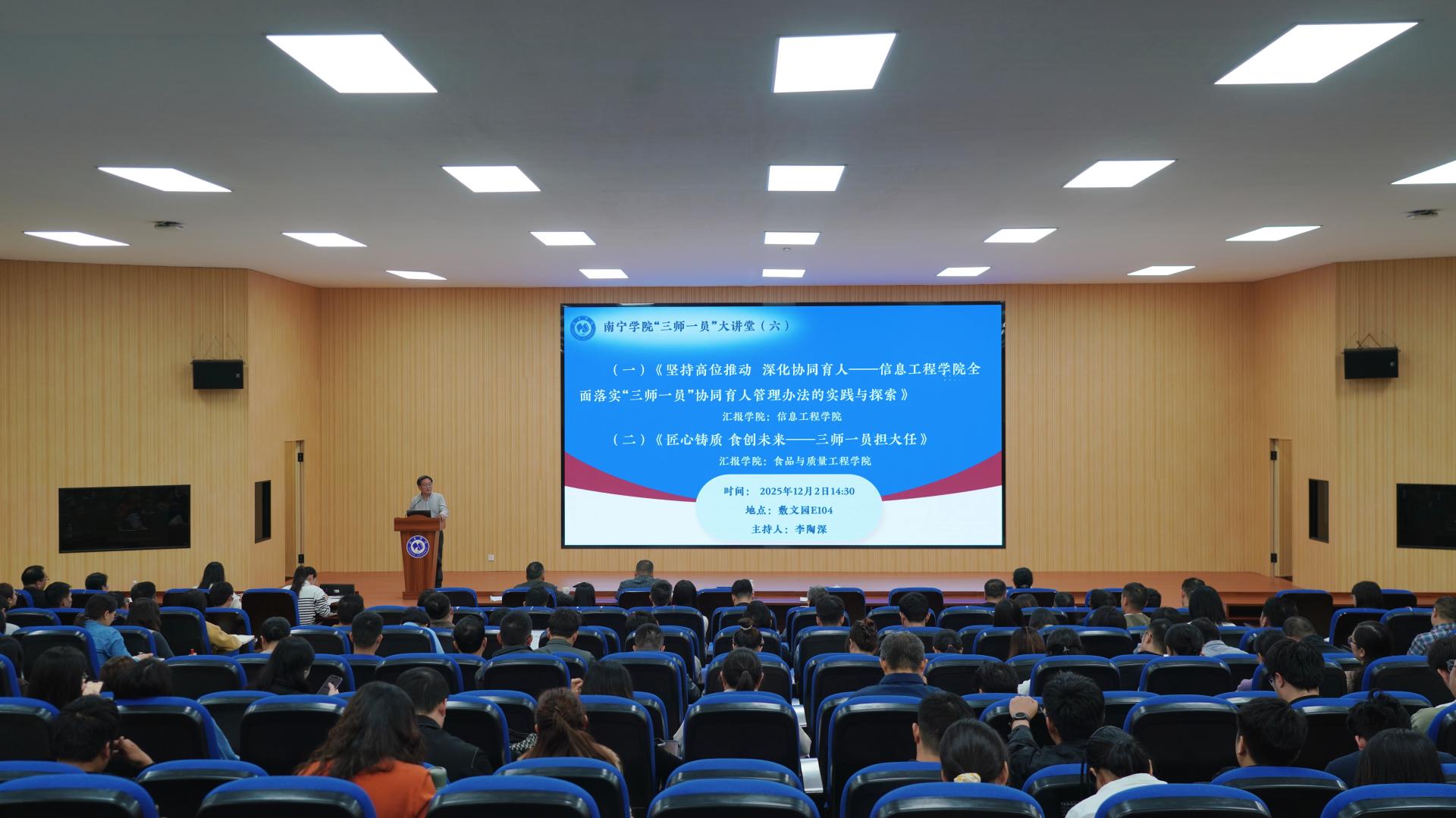 为贯彻落实立德树人根本任务,以协同创新探索育人新路径,12月2日,南宁学院“三师一员”大讲堂第六讲精彩开讲。本次活动以案例为镜、以研讨为径,旨在通过案例研讨,凝练育人新范式,汇聚协同新智慧,为学校“三全育人”综合改革与高质量发展注入新动能。讲座由学校副校长李陶深主持,特邀信息工程学院、食品与质量工程学院进行专题分享,校领导班子、各职能部门与二级学院负责人及教师代表共同参与。