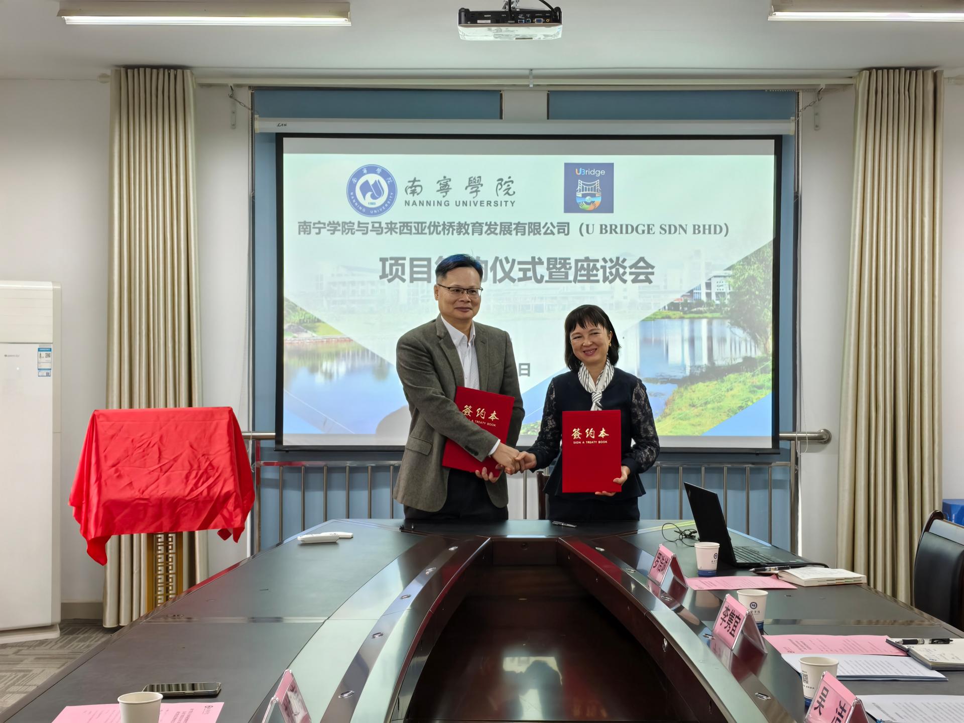 12月12日上午,马来西亚升学英语教育教学基地在我校挂牌成立。马来西亚优桥教育发展有限公司(U BRIDGE SDN BHD)董事长刘如涛、项目运营负责人李业勤一行莅临我校参加签约及挂牌仪式,并与东盟学院举行座谈会。东盟学院院长吴洁、发展规划与合作交流处副处长兼东盟学院副院长李隽宜、东盟学院第一教研室主任陈柳彬、专任教师全淇言、国际合作交流科干事罗浩诚出席上述活动。